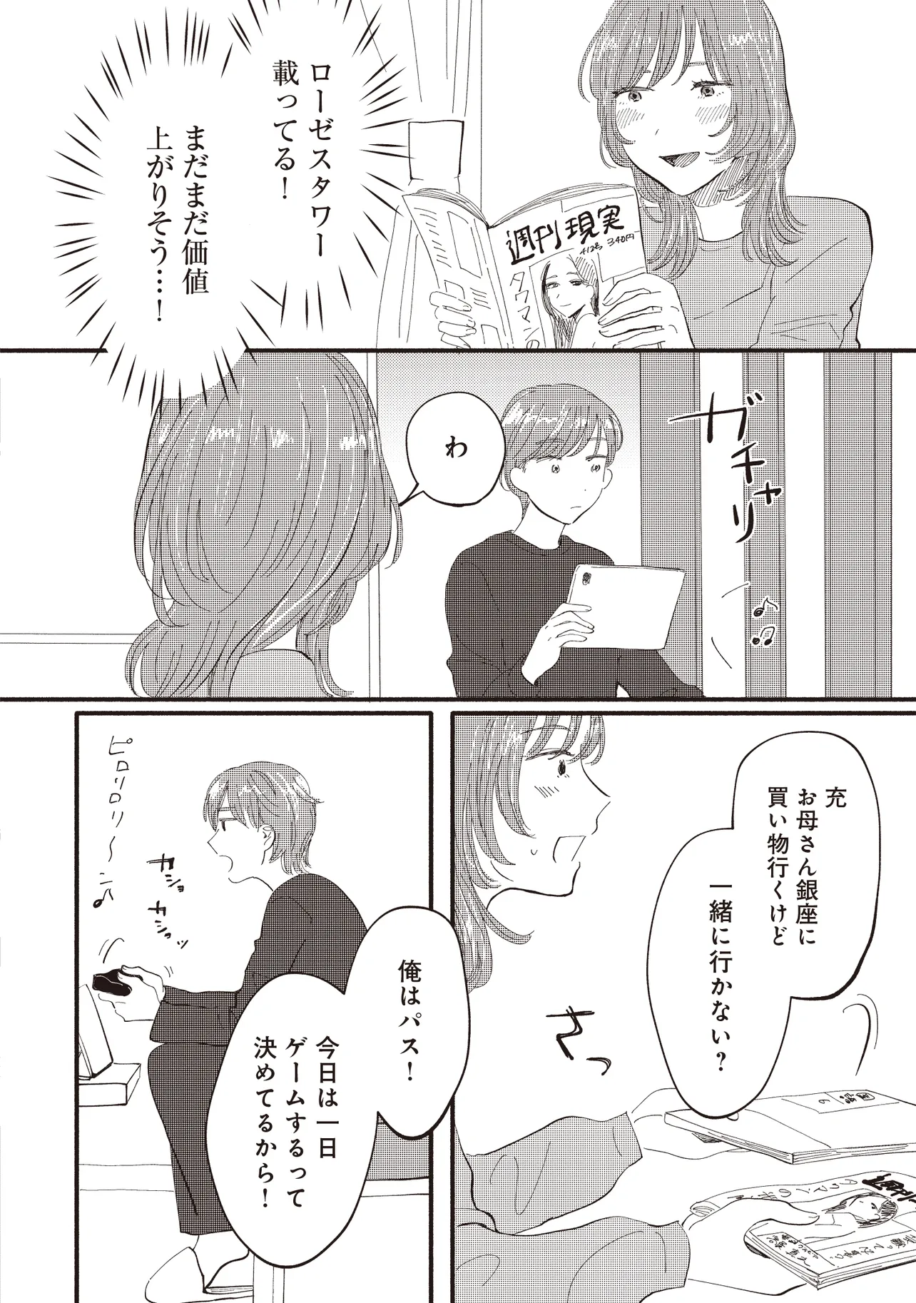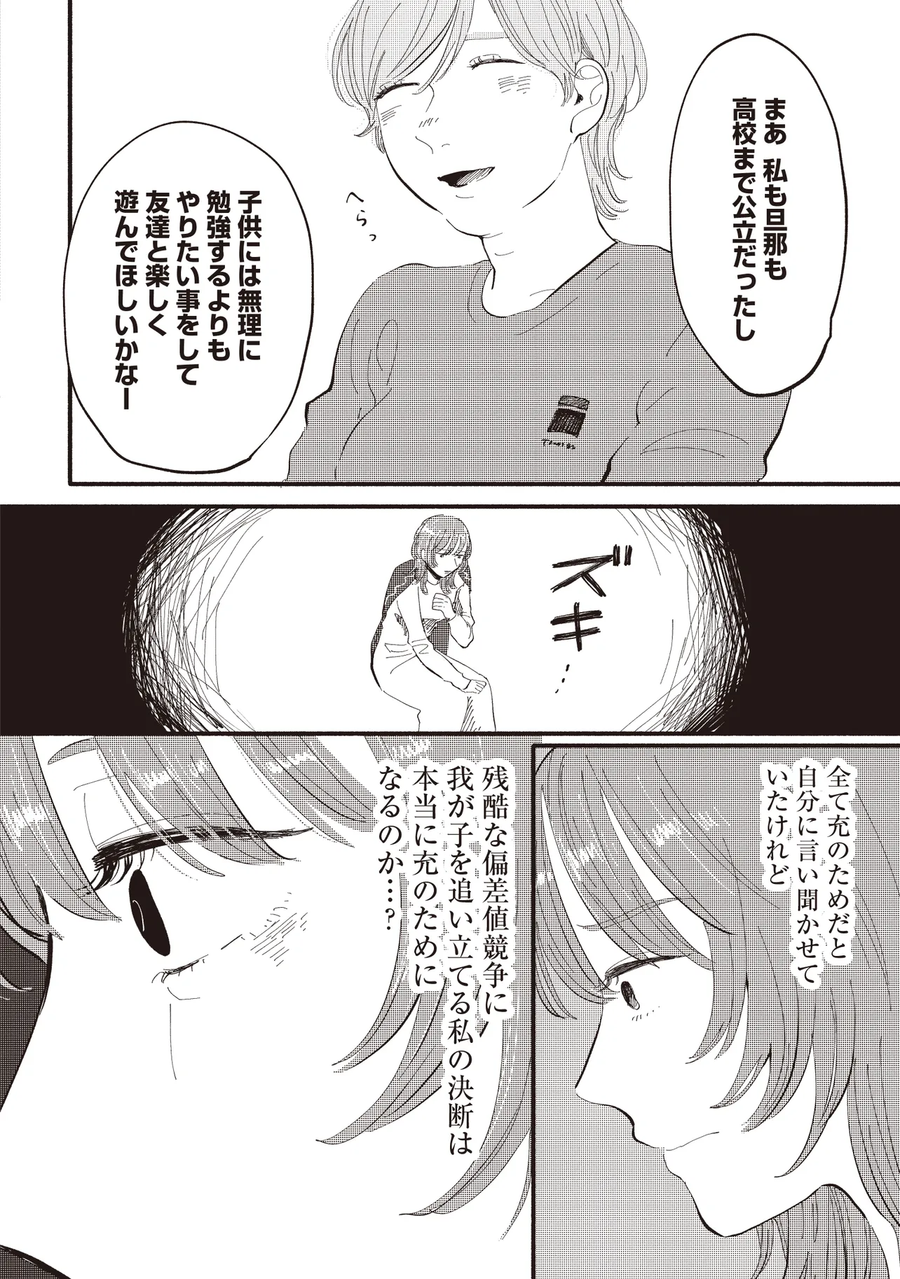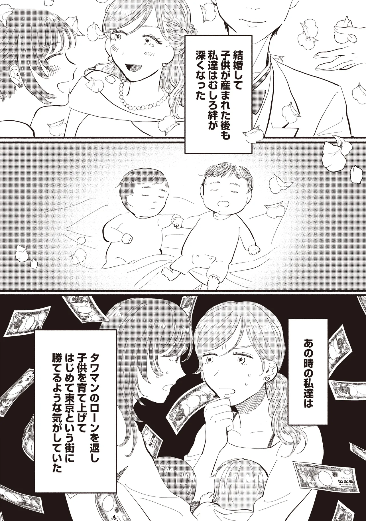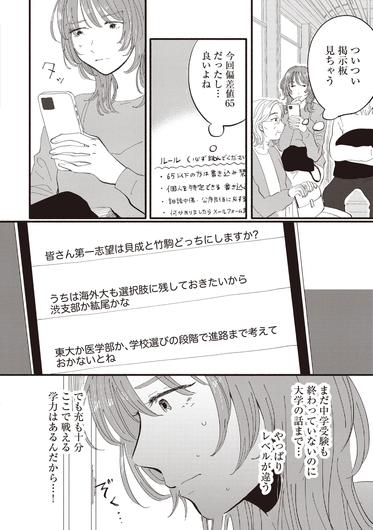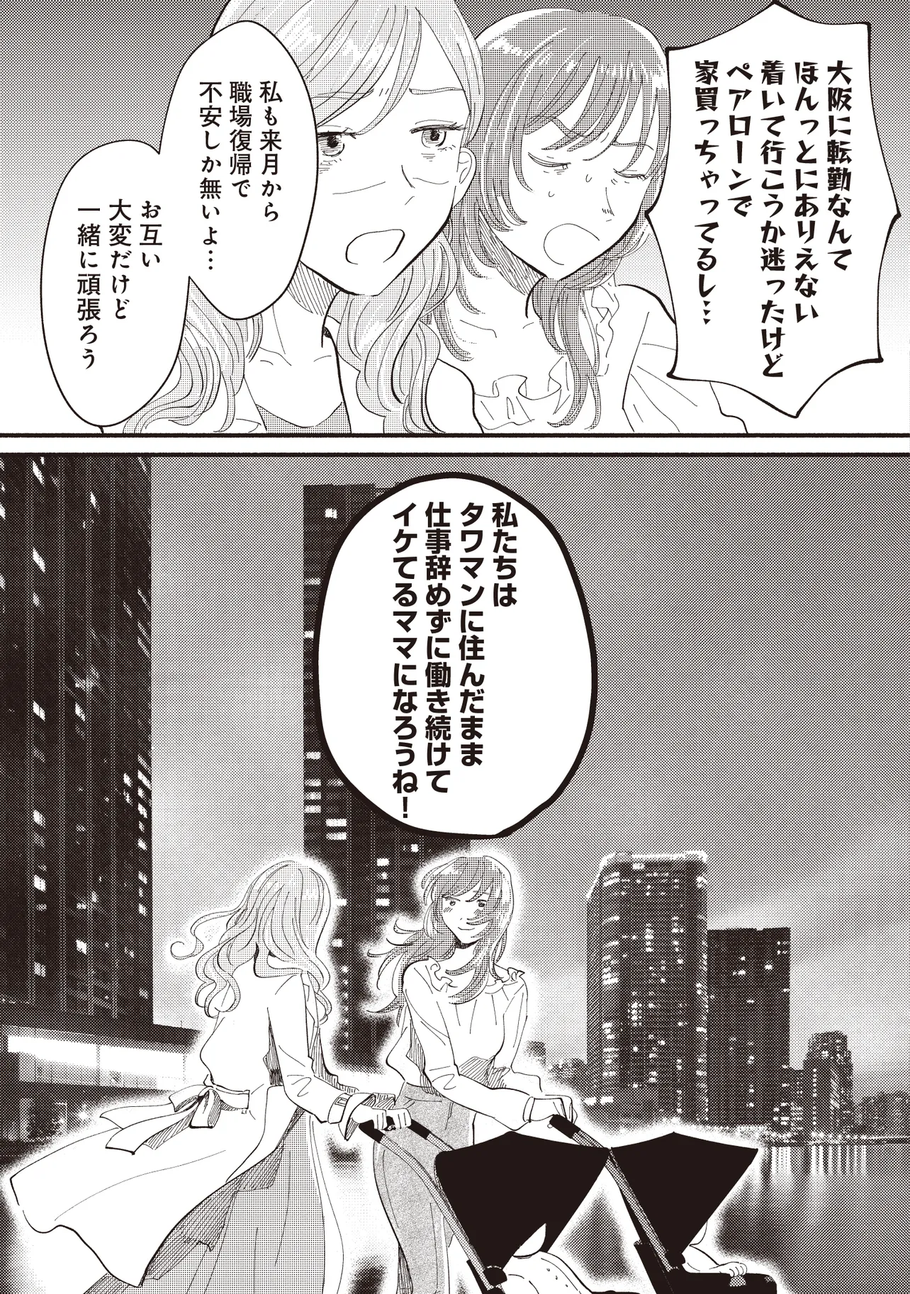 大手銀行の一般職として働く平田さやかは、念願のタワマンに住みながらも日々ストレスが絶えない。一人息子である充の過酷な受験戦争、同じマンションの最上階に住む医者一族の高杉家、そして総合職としてエリートコースを歩む同僚やPTAの雑務。種々のストレスから逃れたいと思ったとき、向かったのは親友・マミの元だった。かつては港区で一緒に遊び回り、夢を語り合った二人だったが――。