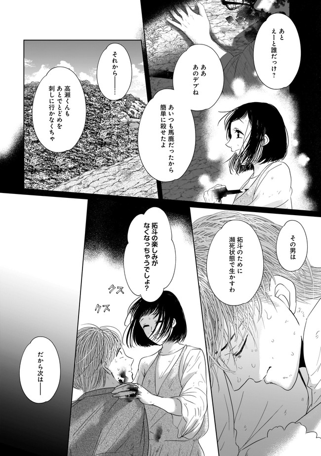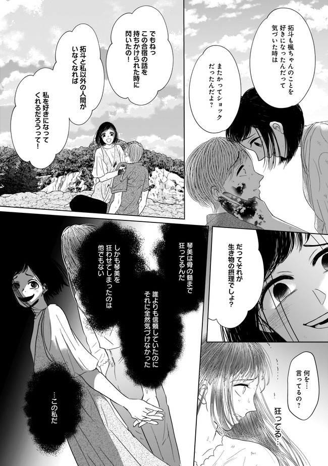 大学生の楓は、所属するワンダーフォーゲル部のメンバーと、とある無人島に来ていた。有名企業の御曹司の悠馬が所有する島でサバイバル生活を体験することになったのだ。わがままで身勝手な部長の悠馬、正義感の強い爽やかな性格の拓斗、ミステリアスなイケメンの高瀬、さらに悠馬を狙う4人の女子など総勢9人で始まったサバイバル生活は楽しい夏の思い出になるはずだった。だが、3日後に来るはずの迎えは一向に現れず、漂着した迎えの船には死体となった操縦士が乗っていて……。突如始まる本物の“サバイバルゲーム”。次々と不可解な死を遂げるメンバーたち。それぞれの歪んだ愛が狂気となって迫りくる無人島で、最後に生き残るのは誰なのか――!?