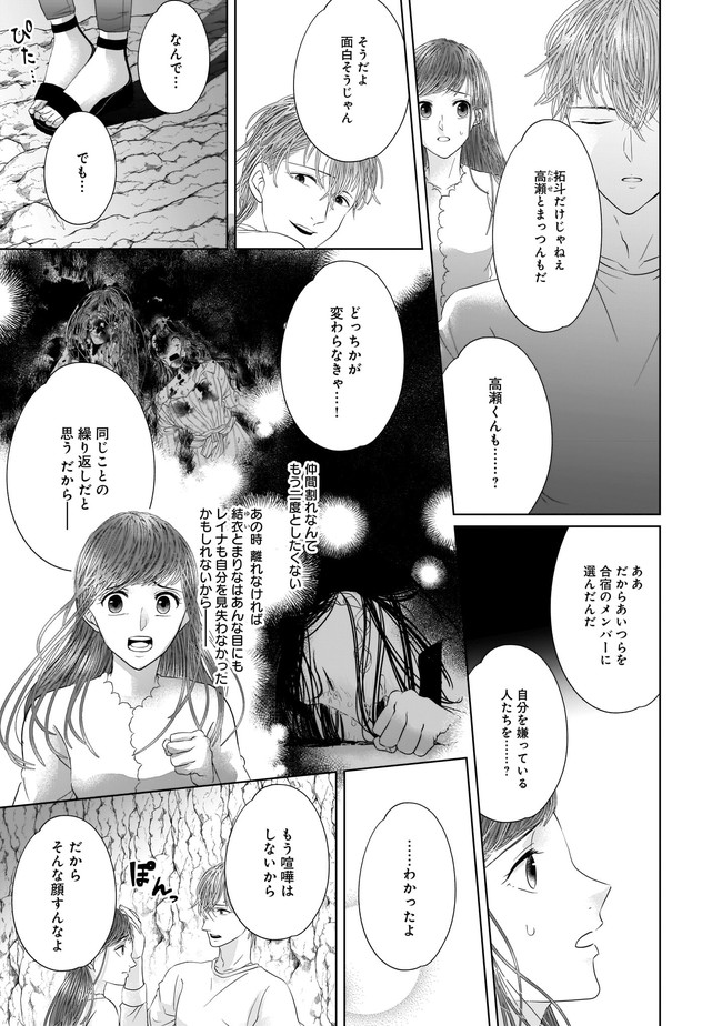 大学生の楓は、所属するワンダーフォーゲル部のメンバーと、とある無人島に来ていた。有名企業の御曹司の悠馬が所有する島でサバイバル生活を体験することになったのだ。わがままで身勝手な部長の悠馬、正義感の強い爽やかな性格の拓斗、ミステリアスなイケメンの高瀬、さらに悠馬を狙う4人の女子など総勢9人で始まったサバイバル生活は楽しい夏の思い出になるはずだった。だが、3日後に来るはずの迎えは一向に現れず、漂着した迎えの船には死体となった操縦士が乗っていて……。突如始まる本物の“サバイバルゲーム”。次々と不可解な死を遂げるメンバーたち。それぞれの歪んだ愛が狂気となって迫りくる無人島で、最後に生き残るのは誰なのか――!?