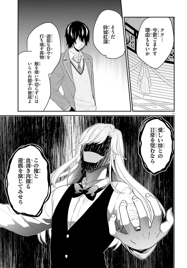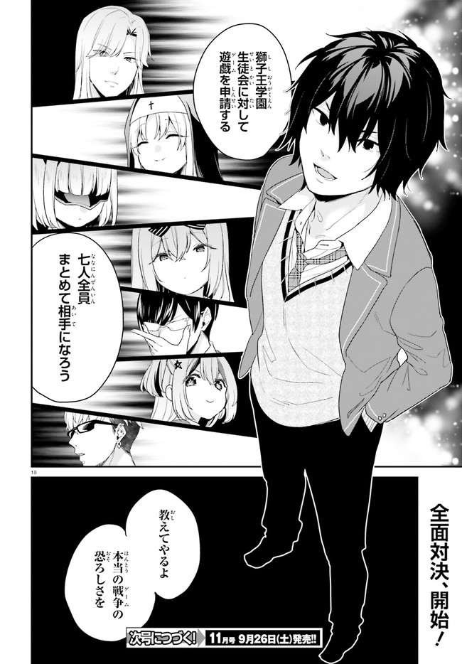 学業、運動、家柄、あらゆる分野のエリートだけを集めた日本最高峰の名門校・獅子王学園。だがその実態は、ゲームの結果ですべてが評価される弱肉強食の学園。絶対的な強者――獅子のみが生き残れる修羅の世界だった。裏世界のゲームで常勝無敗の伝説を残しながらも、面倒のない普通の人生を歩みたい主人公・砕城紅蓮は、入学試験で手を抜き、目論見通り最低位のFランクに認定される。しかし兄を心から愛する血の繋がった妹・砕城可憐と再会し、事態は急変。そして学園の『悪意』が可憐を襲ったとき、紅蓮は真の実力を発揮する――!