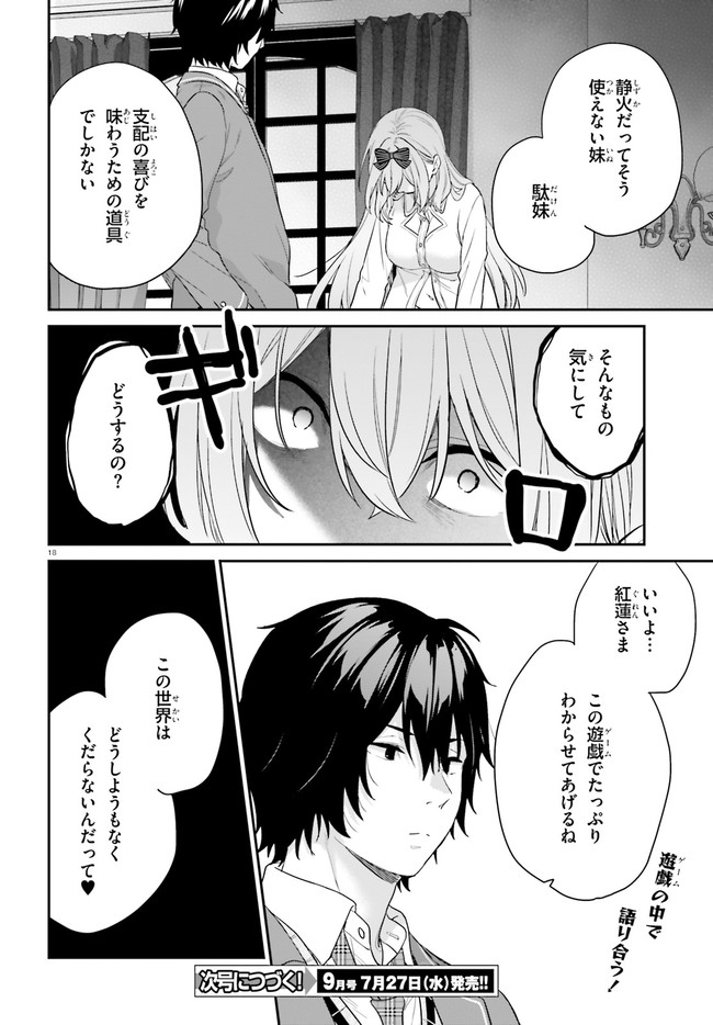 学業、運動、家柄、あらゆる分野のエリートだけを集めた日本最高峰の名門校・獅子王学園。だがその実態は、ゲームの結果ですべてが評価される弱肉強食の学園。絶対的な強者――獅子のみが生き残れる修羅の世界だった。裏世界のゲームで常勝無敗の伝説を残しながらも、面倒のない普通の人生を歩みたい主人公・砕城紅蓮は、入学試験で手を抜き、目論見通り最低位のFランクに認定される。しかし兄を心から愛する血の繋がった妹・砕城可憐と再会し、事態は急変。そして学園の『悪意』が可憐を襲ったとき、紅蓮は真の実力を発揮する――!