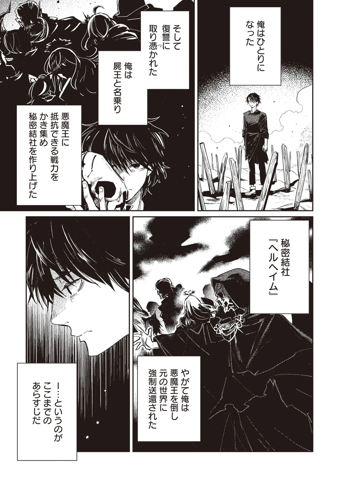 「よくもまあ昔の俺は、こんな恥ずかしいことノリノリでやってたよ!」 中学三年生のとき、異世界に召喚され世界を救った勇者、日崎司央。悪魔王を倒し現代に強制送還された彼は、その三年後、今再び異世界に召喚される。秘密結社「ヘルヘイム」の暴走を止めるために――。 しかし、実はその組織、かつて厨二病を患っていた彼が「屍王」と名乗り組織した、思い出すも恥ずかしい黒歴史だった!? 一体誰が""ヘルヘイム""の名を騙り、悪名を振りまいているのか。その謎を解き明かし組織の汚名を返上すべく、屍王はかつてヘルヘイムを最強たらしめた幹部「八戒」を再集結させ、再び異世界で行動を開始する――黒歴史に悶えながら……。 まずは鉄鋼都市ガギウル。不作に喘ぐ街と窮地に立つ鈍色の伯爵令嬢を救出せよ。 「――ヘルヘイム、作戦開始だ」