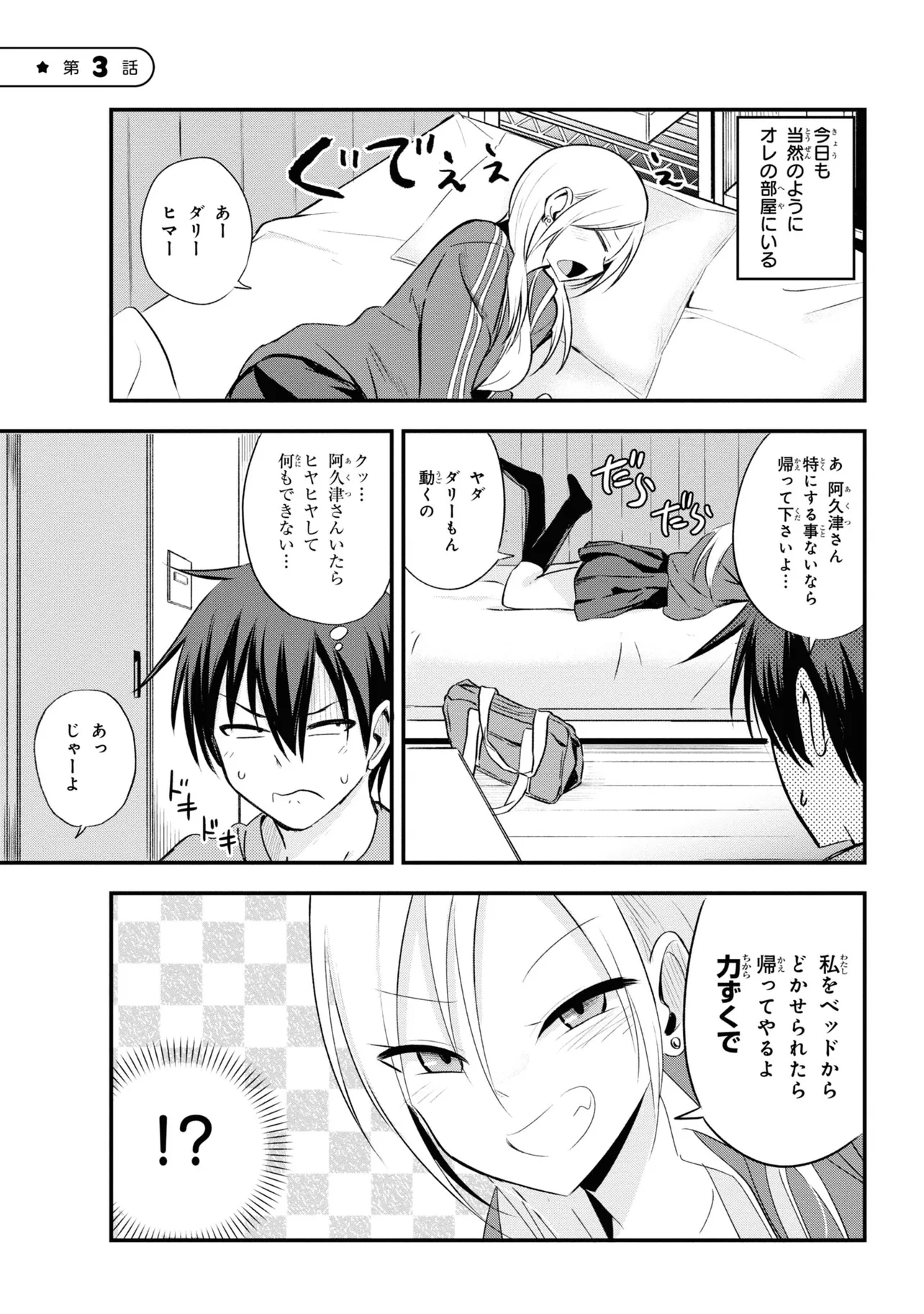 普段は全く関わりのないクラスの不良女子・阿久津さんに何故か家をたまり場にされてしまった一人暮らしの大山くん。ガラの悪い阿久津さんに何かひどいことをされるのではと追い出そうとするのだが、無防備で距離感の近い彼女のエロカワイイ仕草にドギマギしてしまい…? 帰ってほしいのに、帰ってほしくない!? 一つ屋根の下のからかいショートコメディ!