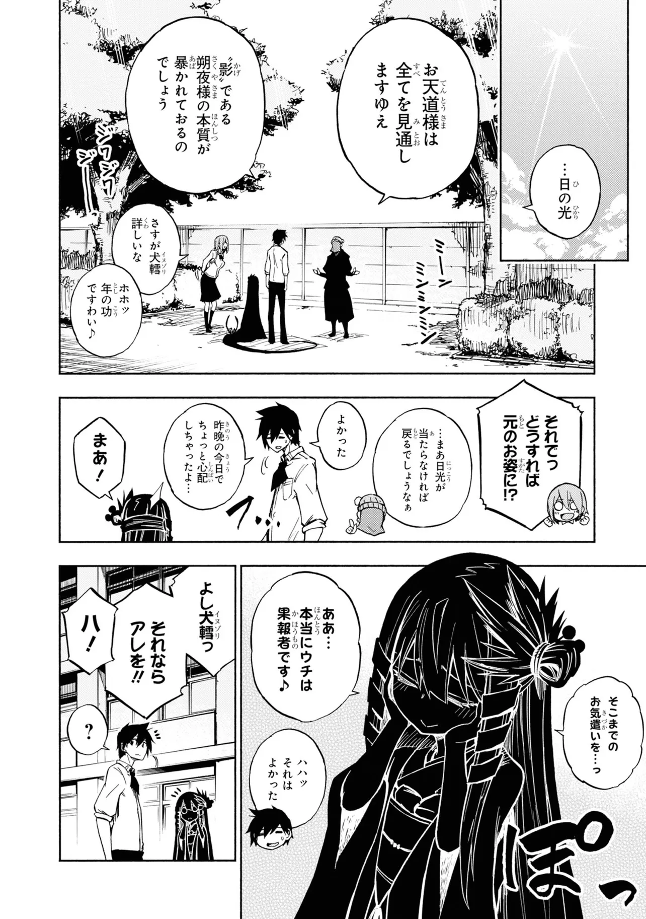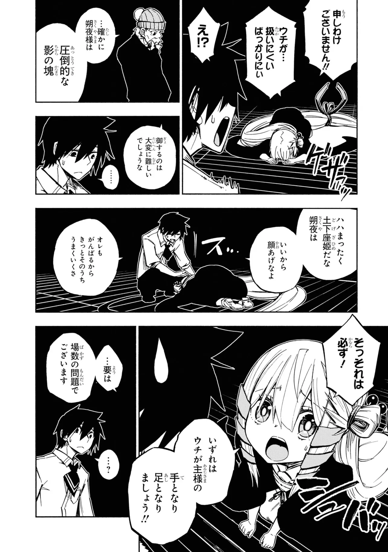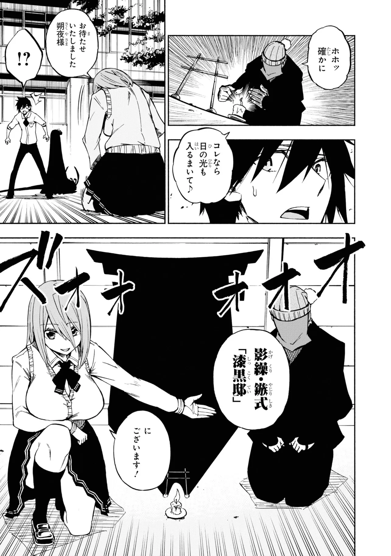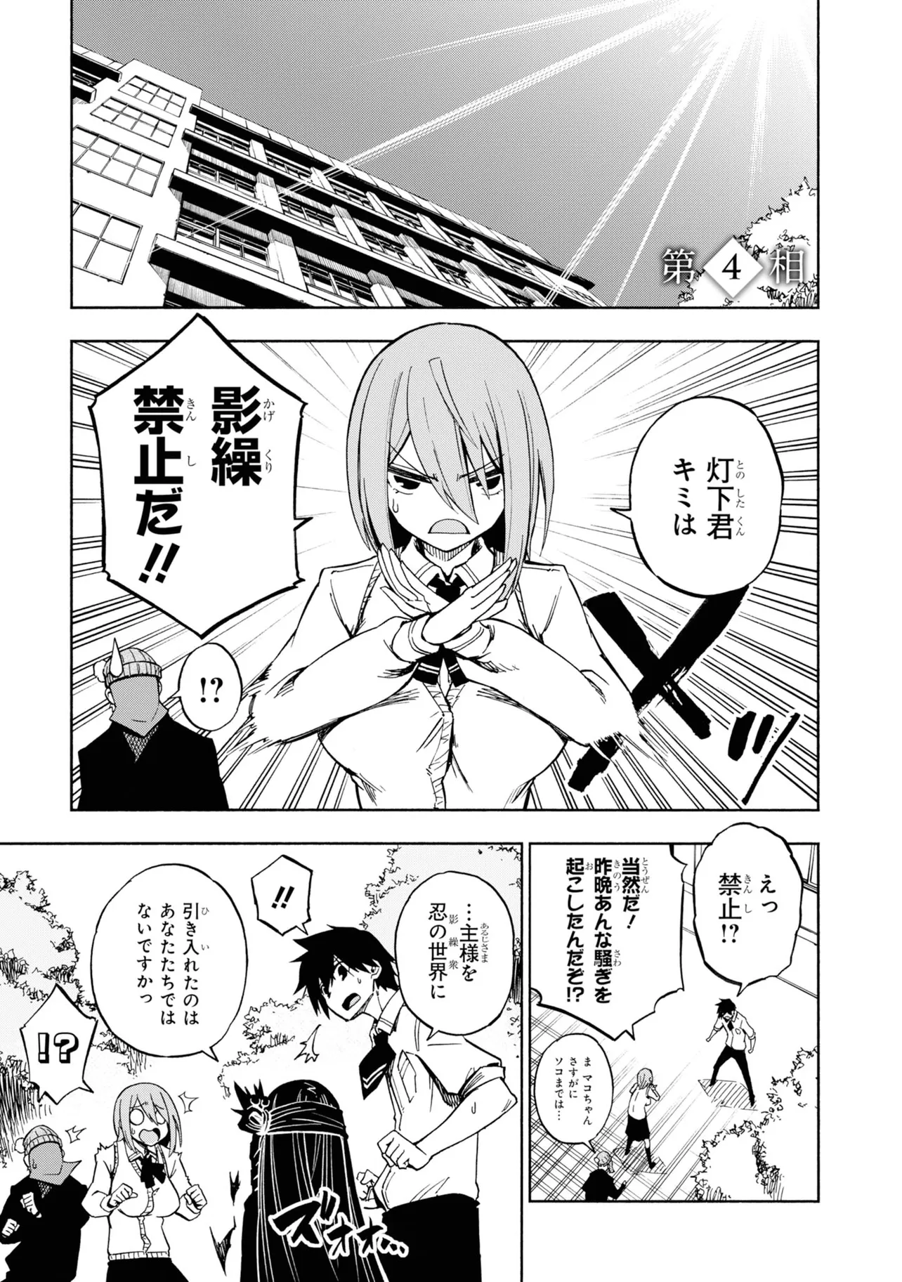 影の中にバケモノを視てしまう灯下肇はある日、影に潜む少女を見つける。今までになかった状況に逃げ戸惑う肇に、その少女はとある取引をもちかけて来て――。影絵×忍者で贈る最先端お色気アクション!