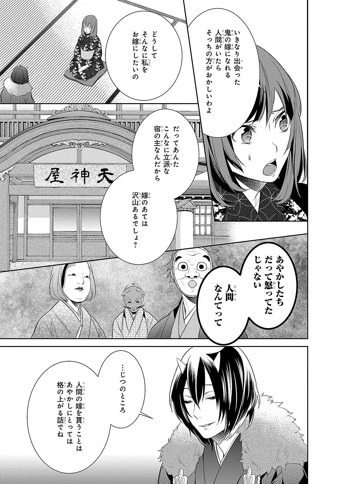 あやかしの棲まう “隠世(かくりよ)”にある老舗宿「天神屋」。 大人気「妖怪×宿飯」ノベル、コミカライズ!! 亡き祖父譲りの「あやかしを見る力」を持つ女子大生・葵は、 得意の料理で野良あやかしを餌付けていた最中、 突然「天神屋」の大旦那である鬼神にさらわれてしまう。 大旦那曰く、祖父が残した借金のカタとして、 葵は大旦那に嫁入りしなくてはならないのだという。 嫌がる葵は起死回生の策として、 「天神屋」で働いて借金を返済すると宣言してしまうのだが……。 あやかしお宿を舞台に繰り広げる、葵の細腕繁盛記!