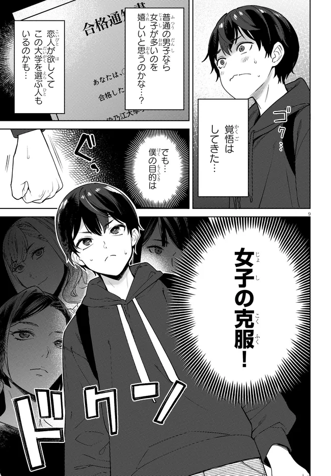 女子が苦手なことで苦労をしてきた青年・蓮。弱点を克服するべく、女子率9割の難関大学・染之江大学に入学&男が自分と合わせて二人しかいない元女子寮で暮らすことに。緊張とこれからの生活に先行き不安な連。そんな転校初日、先輩のクールな女子大生・紅にSEXを誘われてしまう!!? 女性が苦手な蓮は、このままバラ色のハーレム生活がスタートするのか!!!!