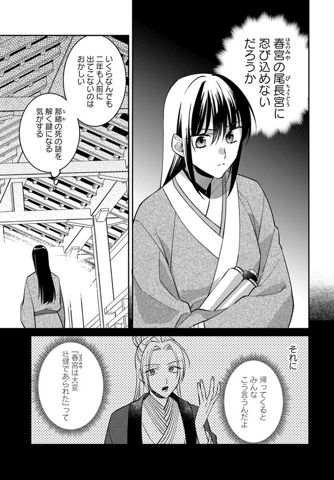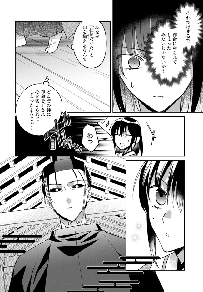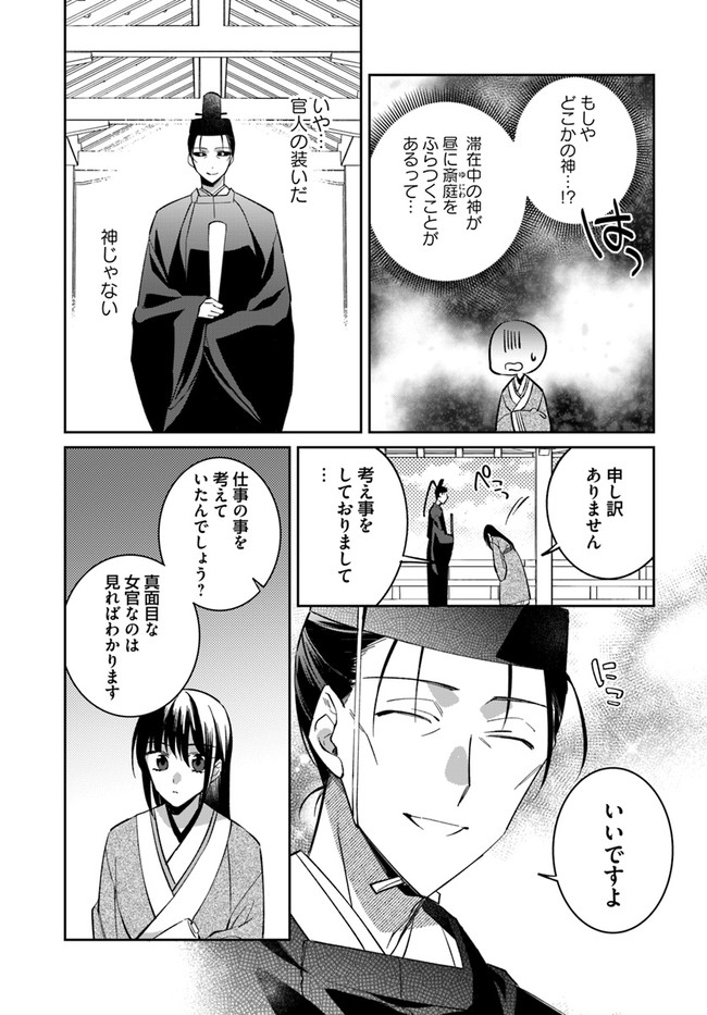 兜坂国の斎庭(後宮)は、神を招き、もてなす場。 実体を持つ神々は豊穣と繁栄を招く反面、ひとたび荒ぶれば恐ろしい災厄を国にもたらす。 地方の郡領の娘・綾芽は、親友の死の真相を探るため上京した。 そこで偶然、荒ぶる女神を鎮めてみせた綾芽は、王弟の二藍に斎庭の女官として取り立てられる。 だが、それは国の存亡を揺るがす事件の幕開けに過ぎなかった……。