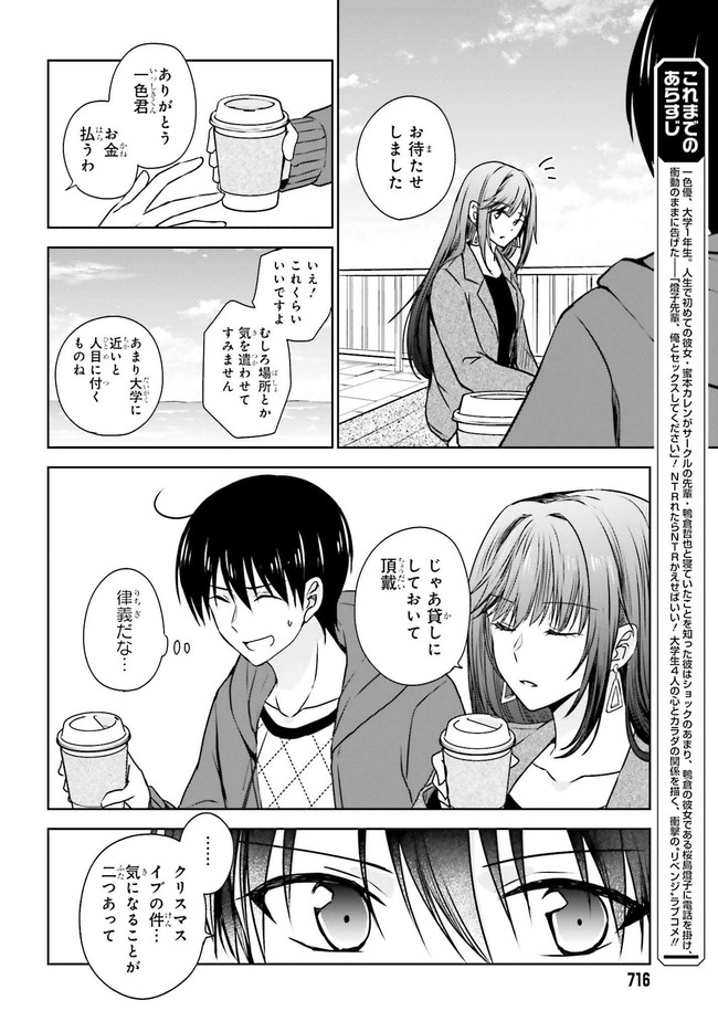 人生で初めての彼女・カレンがサークルの先輩・鴨倉と寝ていたことを知った彼はショックのあまり、鴨倉の彼女である燈子に電話を掛け、衝動のままに告げた――「燈子先輩、俺とセックスしてください」!