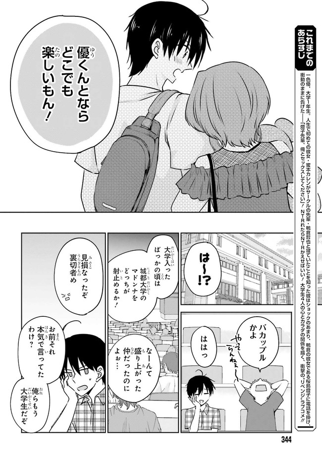 人生で初めての彼女・カレンがサークルの先輩・鴨倉と寝ていたことを知った彼はショックのあまり、鴨倉の彼女である燈子に電話を掛け、衝動のままに告げた――「燈子先輩、俺とセックスしてください」!