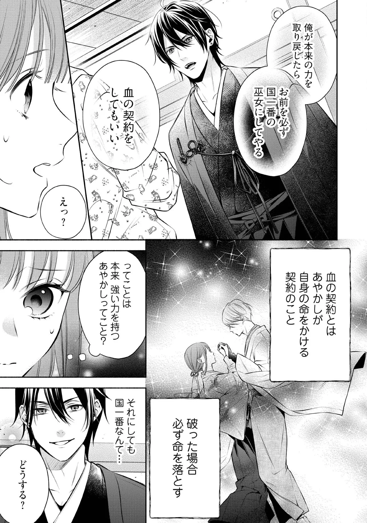 「俺は生涯、お前を手放すつもりはない」 人間とあやかしが共存する世界。かつて闇堕ちしたあやかしに両親を殺されたすみれは、巫女になることを唯一の夢として生きてきた。しかし何故か霊力が減少し、今や落ちこぼれとして周囲から虐げられ、その夢も危うい立場。そんなある日、すみれは弱ったあやかしを介抱し、彼の回復のために自身の霊力を分け与える血の契約を結ぶ。 彼こそが最高の地位と美貌を持つ鴉天狗だった!