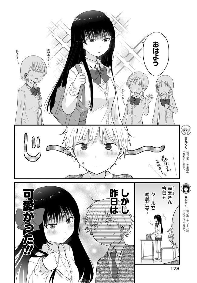 背が小さくて童顔の「かわいい」田丸くんが恋してるのは、背が高くてクールな森永さん。 自分にはとても釣り合わないと思っていた田丸くんだが、ある日森永さんの意外過ぎる姿を見てしまい……? 誰にも言えない「かわいい」だらけのラブコメディー☆ コミックス2巻、好評発売中!