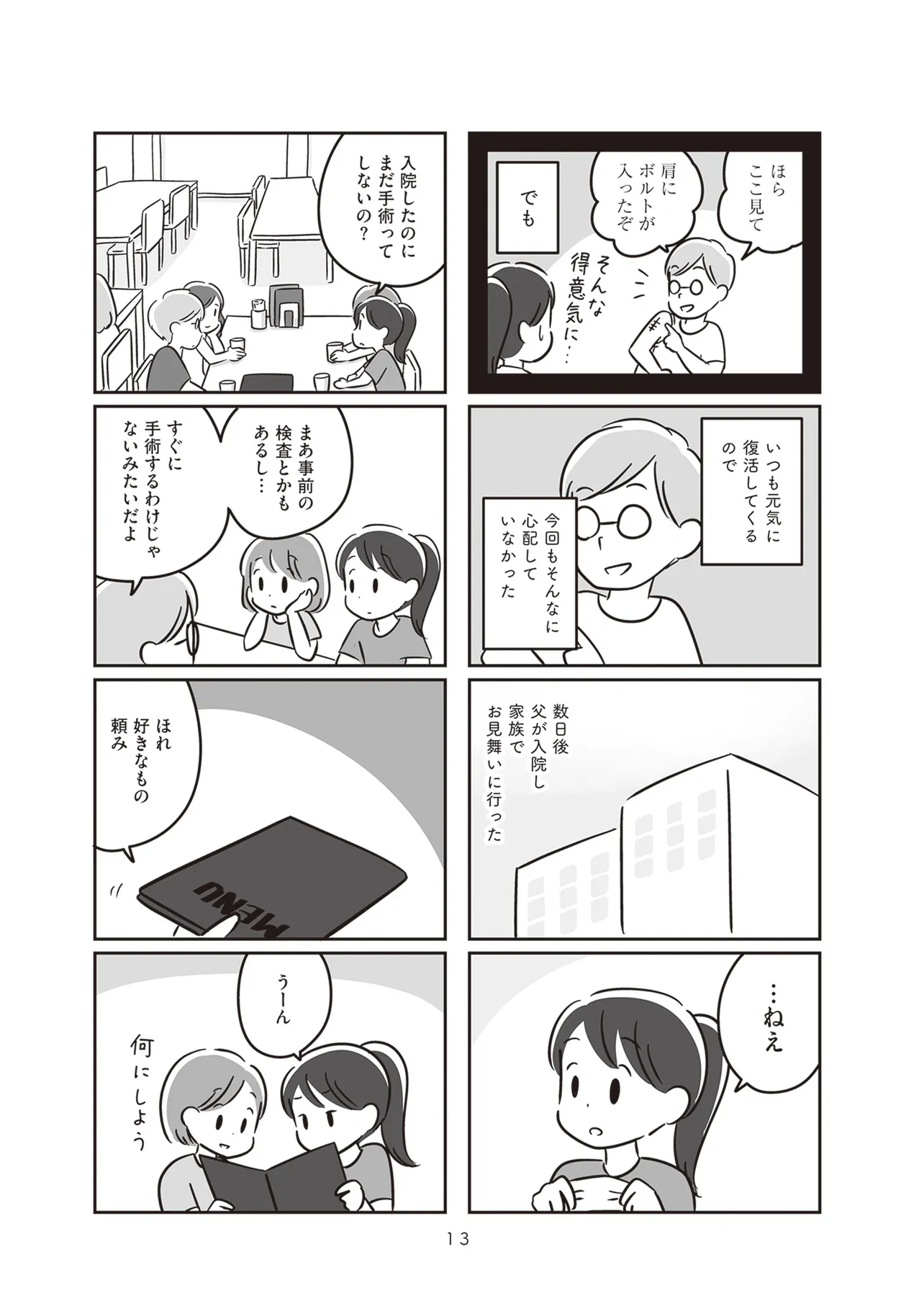1996年夏。高校1年生のエミは、サラリーマンの父、専業主婦の母、中学2年生の妹と平穏に暮らしていた。しかしある日、父・ヒロシは脳にできた腫瘍が破裂した影響で、半身まひや失語症の障害を負ってしまう。さらに記憶能力が大幅に欠如し、家族の顔さえわからなくなってしまった父。エミは突然の事態に戸惑いながらも回復を信じ、母親や妹とともに父親を支える日々を送っていくが、一緒に暮らすにつれて、徐々に厳しい現実を突きつけられていく。そして思春期、就職、結婚、出産と、人生のステージが進むにつれ、エミは父親とどう向き合うべきなのか、わからなくなってしまうのだった。脳に障害を負った父親を支える家族の葛藤を赤裸々に描いた、胸えぐる実話コミックエッセイ。