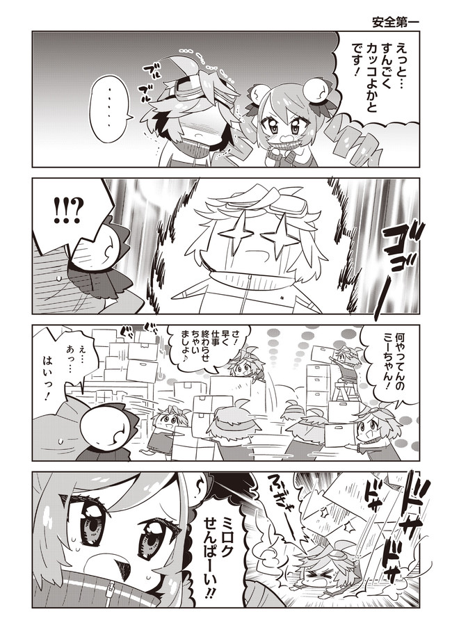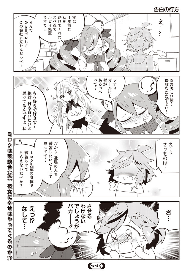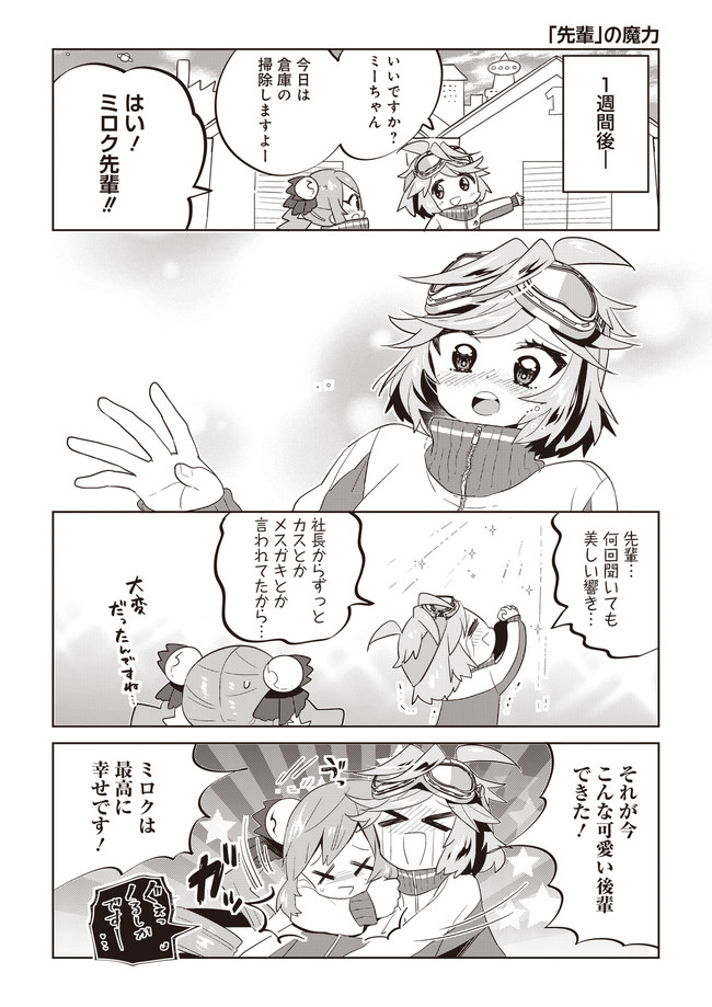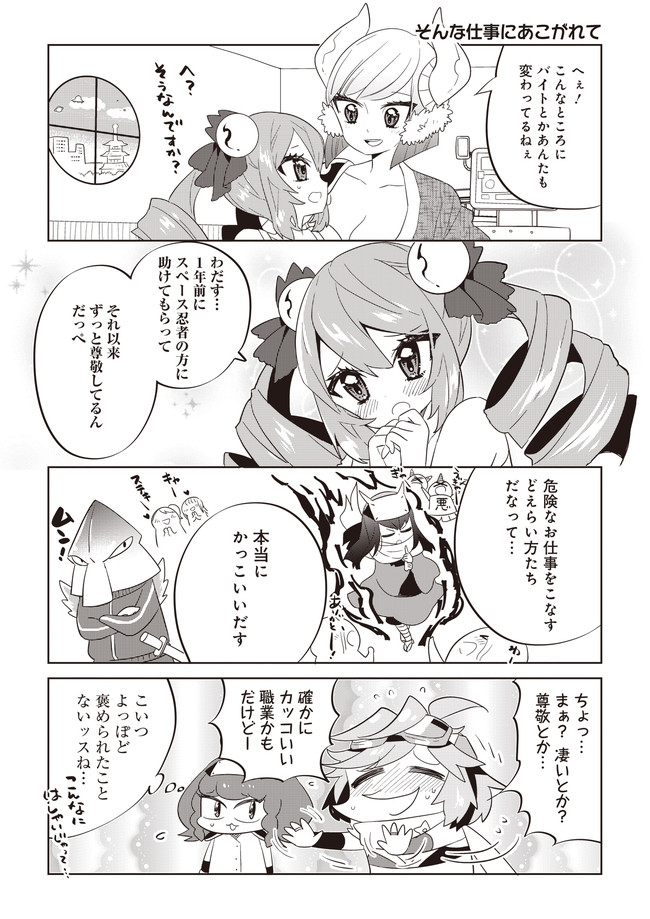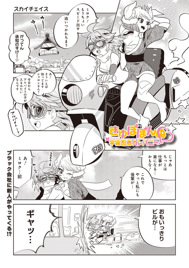 広い宇宙を舞台に、ざまざまな問題を解決する「スペース忍者」の会社に入社した鴨川ミロクのちょっとブラック&エチチチな4コマ漫画♡