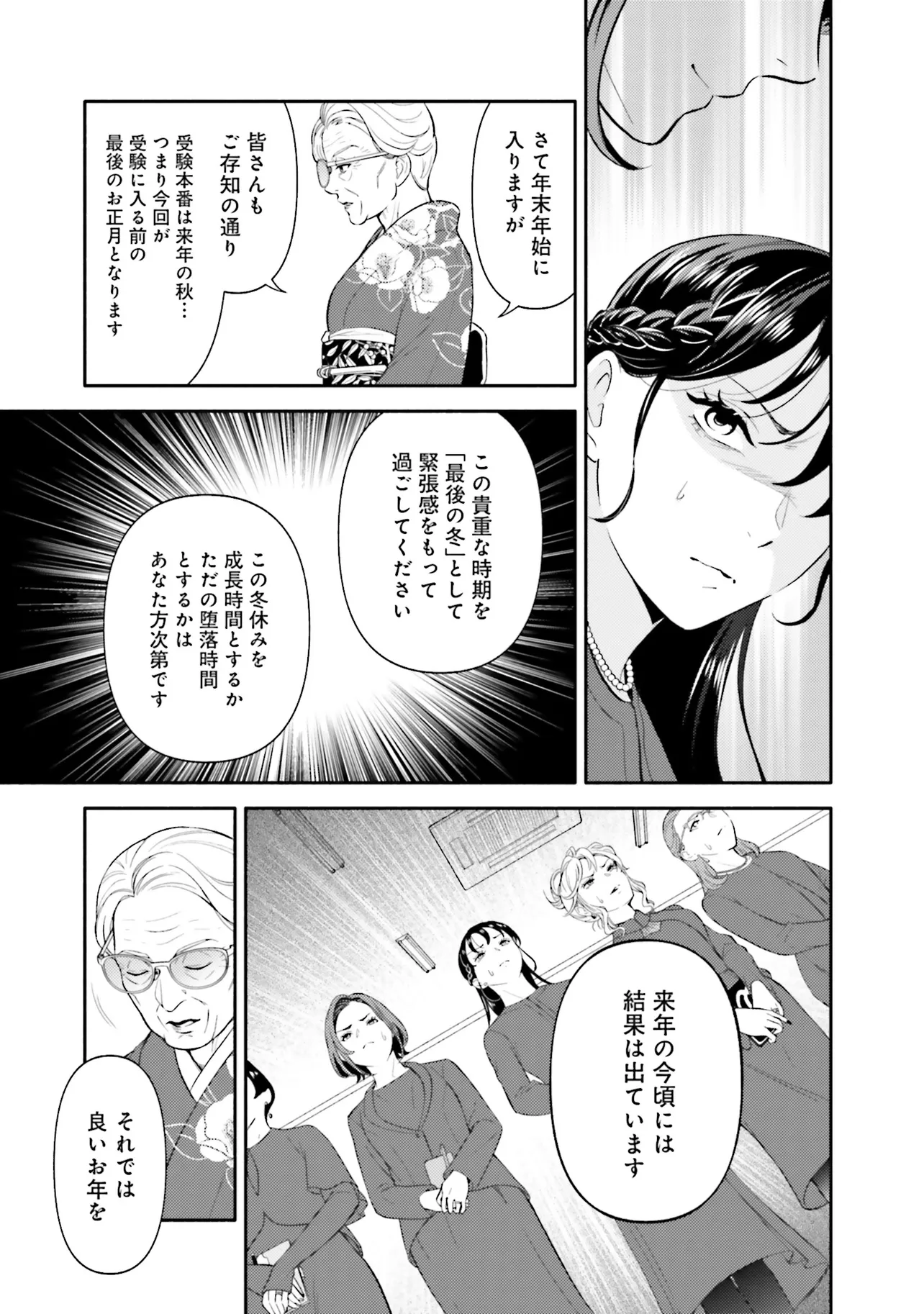 『小学校受験で試されるのは子供ではありません。家族です』 大手化粧品メーカーで働く新田茜は、ふたりの子を持つワーキングマザーだが、中学受験の過酷さを知り、小学校受験に興味を持つように。 テレビ局記者の夫を持ち、世間的にはパワーカップルと呼ばれる茜たちだが、お受験の世界はさらに上の富裕層との戦いだった。 仕事と家庭の両立、協力してくれない夫、かさんでいく教育費…。「子どもの将来にできる限りの可能性を与えたい」――はじまりはそれだけだったはずなのに…。 そして、お受験塾で知り合ったママ友たちもまた、それぞれの地獄を抱えており――?