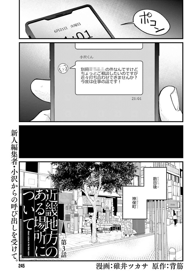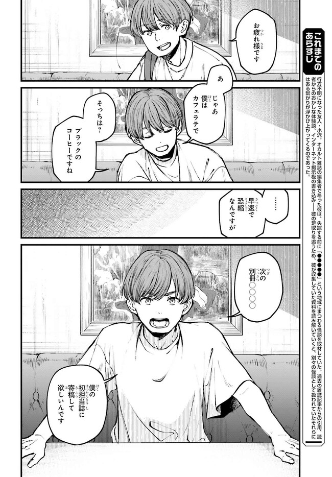近畿地方のある場所について 第3話 近畿地方のある場所について 投稿者 admin - 2年 前に 幸せな読書漫画 近畿地方のある場所について 第3話 , いいねと共有ボタンをクリックすることを忘れないでください. Manga 近畿地方のある場所について 常に更新されます 無料コミック Comic Top. 他のマンガの更新を読むことを忘れないでください。 マンガコレクションのリスト 無料コミック Comic Top マンガリストメニューにあります. お友達と共有しましょう! Facebook Twitter Pinterest Whatsapp 前のエピソード すべての章 次のエピソード リスト ページング Loading.. 前のエピソード すべての章 次のエピソード リスト ページング お友達と共有しましょう! Facebook Twitter Pinterest Whatsapp お気に入りに追加に続く 3 人 近畿地方のある場所について 行方不明になった友人・小沢。オカルト雑誌の編集者であった彼は、失踪する前に「●●●●●」という地域にまつわる怪談を取材していた。過去の雑誌記事からの引用、読者からのおかしな体験談、インターネット掲示板の書き込みーー彼の足取りを追うため、彼が収集していた資料を読み解いていくと、別々の怪談として扱われていたそれらにはある繋がりが浮かび上がってくるのであった。 小説投稿サイト「カクヨム」で発表され、口コミ的に波紋を呼んだ怪作モキュメンタリーホラーがコミック化。 碓井ツカサ(漫画)背筋(原作) ホラー・オカルト心霊怪異都市伝説