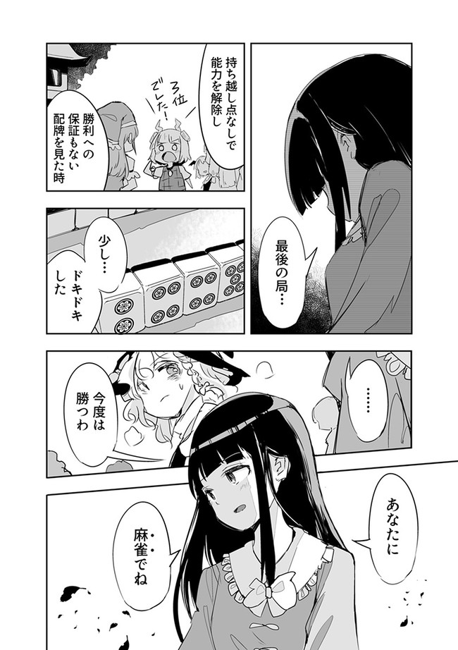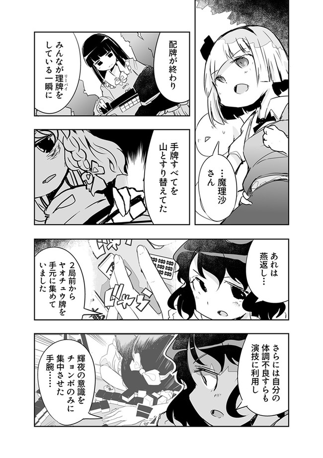 みょんなことから白玉楼の権利書を賭けて麻雀で勝負することになってしまった魂魄妖夢。だが麻雀初心者の妖夢に立ちふさがるのは「相手の心を読む程度の能力」を持つ妖怪・古明地さとり・・・ッ! はたして妖夢はこのピンチを潜り抜けられるのか?