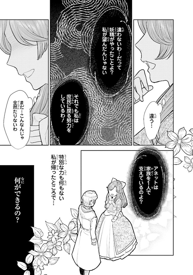 妖精に取り替えられてしまった貴族の赤ちゃんと庶民の赤ちゃん。 貴族として育てられ、13歳に成長したアンナは、家族の中で自分だけ容姿が似ておらず、魔法がうまく使えないことに日々悩んでいた。 そんなある日、目の前に妖精が現れて――。