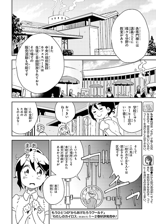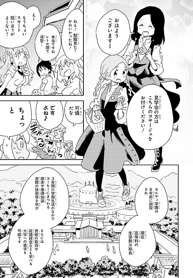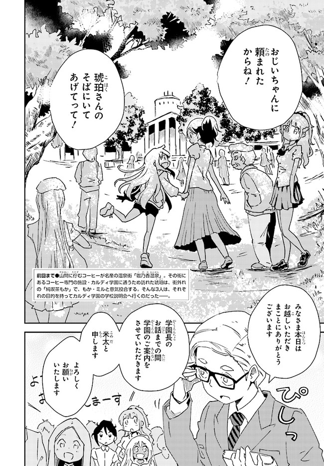 山間に佇むコーヒーが名産の温泉街「珈乃香温泉」。 その街にあるコーヒー専門の施設・カルディ学園に通うためこの地を訪れた琥珀は、街外れの「純喫茶もか」で働く不思議な少女もか・街に住む世話好き少女ミルの2人と意気投合する。 そんな3人は、カルディ学園の学校説明会へ行くことになったが、そこで待っていたのは――?