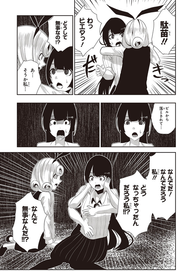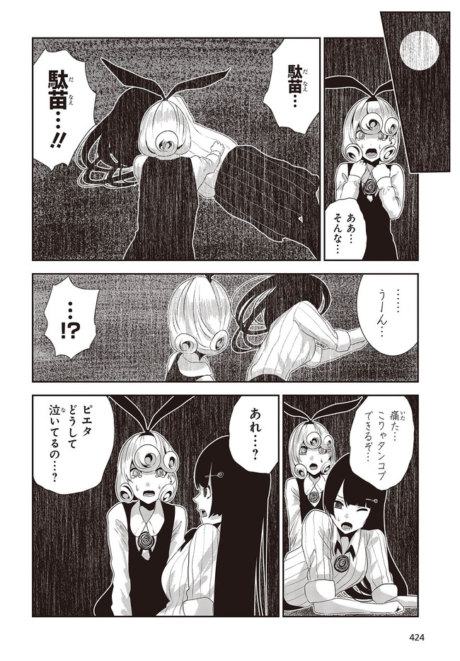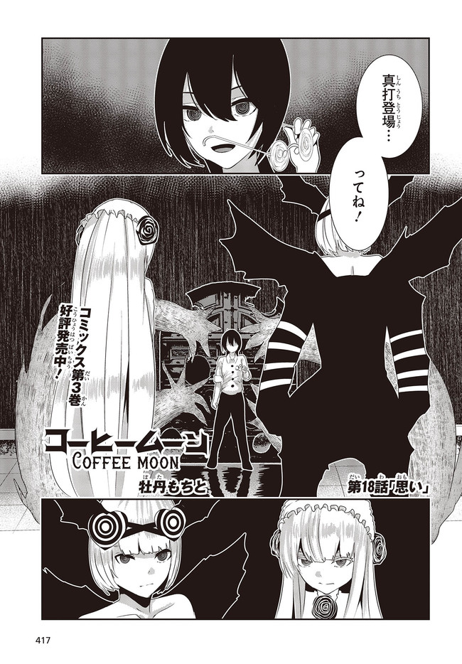 コーヒームーン 第18話「思い」① コーヒームーン 投稿者 admin - 3年 前に 幸せな読書漫画 コーヒームーン 第18話「思い」① , いいねと共有ボタンをクリックすることを忘れないでください. Manga コーヒームーン 常に更新されます 無料コミック Comic Top. 他のマンガの更新を読むことを忘れないでください。 マンガコレクションのリスト 無料コミック Comic Top マンガリストメニューにあります. お友達と共有しましょう! Facebook Twitter Pinterest Whatsapp 前のエピソード すべての章 次のエピソード リスト ページング Loading.. 前のエピソード すべての章 次のエピソード リスト ページング お友達と共有しましょう! Facebook Twitter Pinterest Whatsapp お気に入りに追加に続く 0 人 コーヒームーン 黒く、黒く、黒く。 黒く染まるその世界《なか》で 少女の日常は廻る――。 黒い雨が降る世界で少女・ピエタはなんでもない日常を送っていた。 いつもどおり雨が降っていて、いつもどおりの道を歩いて学校に向かい、友人・駄苗との会話を楽しむ。 そんな『いつもどおり』に幸せを感じていた。 そんな『いつもどおり』を過ごすピエタ。 その日もまた駄苗との会話を楽しむ――はずだった。 「でもどうして! どうしてピエタは昨日の今日のことを覚えてるの!!?」 のたうち回りながら、少女たちは「明日」を目指す――。 牡丹もちと(著者) SFコメディサスペンス日常