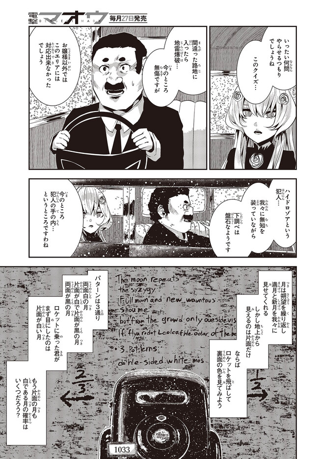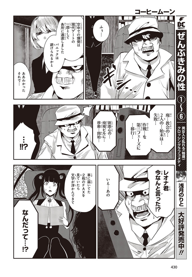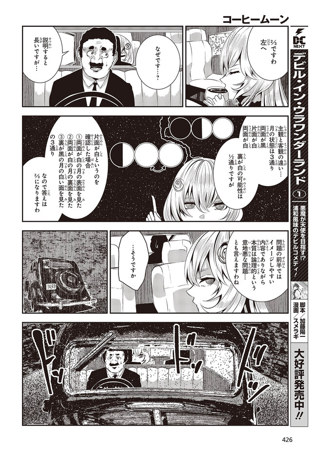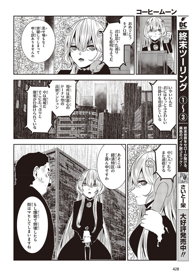 コーヒームーン 第28話「私は幸せな人間なのか、」② コーヒームーン 投稿者 admin - 3年 前に 幸せな読書漫画 コーヒームーン 第28話「私は幸せな人間なのか、」② , いいねと共有ボタンをクリックすることを忘れないでください. Manga コーヒームーン 常に更新されます 無料コミック Comic Top. 他のマンガの更新を読むことを忘れないでください。 マンガコレクションのリスト 無料コミック Comic Top マンガリストメニューにあります. お友達と共有しましょう! Facebook Twitter Pinterest Whatsapp 前のエピソード すべての章 次のエピソード リスト ページング Loading.. 前のエピソード すべての章 次のエピソード リスト ページング お友達と共有しましょう! Facebook Twitter Pinterest Whatsapp お気に入りに追加に続く 0 人 コーヒームーン 黒く、黒く、黒く。 黒く染まるその世界《なか》で 少女の日常は廻る――。 黒い雨が降る世界で少女・ピエタはなんでもない日常を送っていた。 いつもどおり雨が降っていて、いつもどおりの道を歩いて学校に向かい、友人・駄苗との会話を楽しむ。 そんな『いつもどおり』に幸せを感じていた。 そんな『いつもどおり』を過ごすピエタ。 その日もまた駄苗との会話を楽しむ――はずだった。 「でもどうして! どうしてピエタは昨日の今日のことを覚えてるの!!?」 のたうち回りながら、少女たちは「明日」を目指す――。 牡丹もちと(著者) SFコメディサスペンス日常
