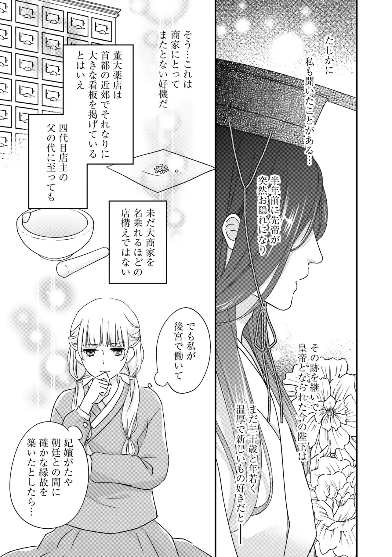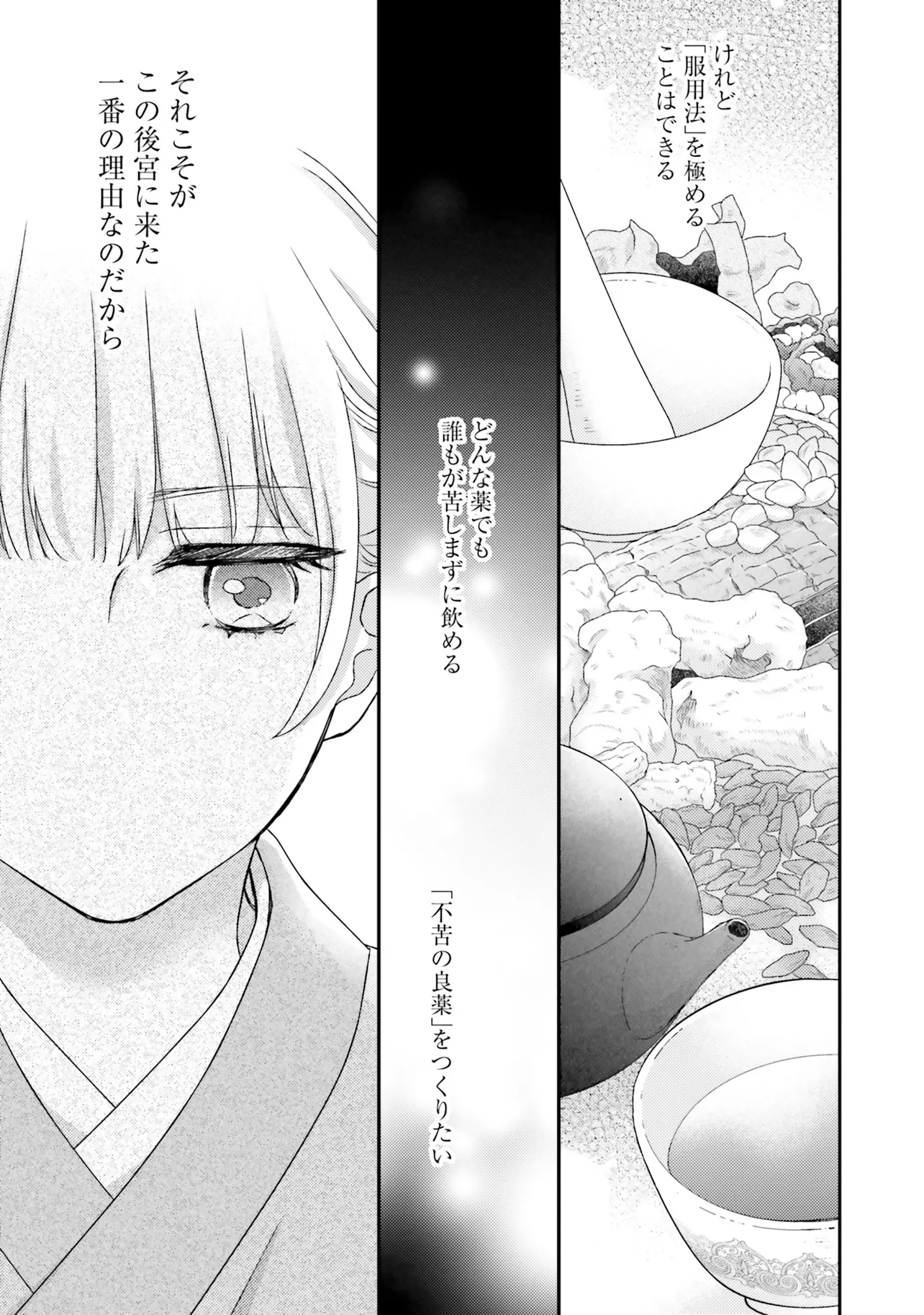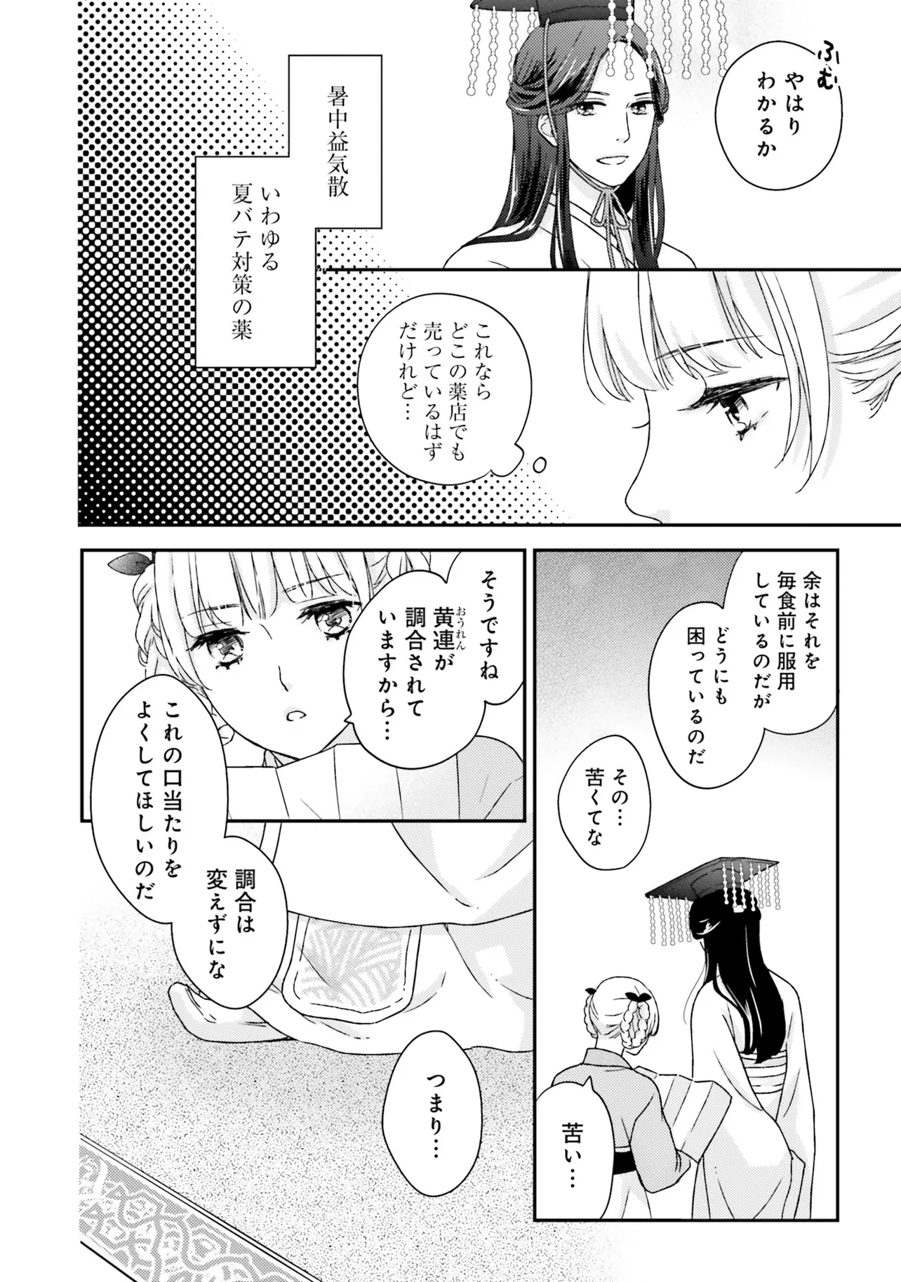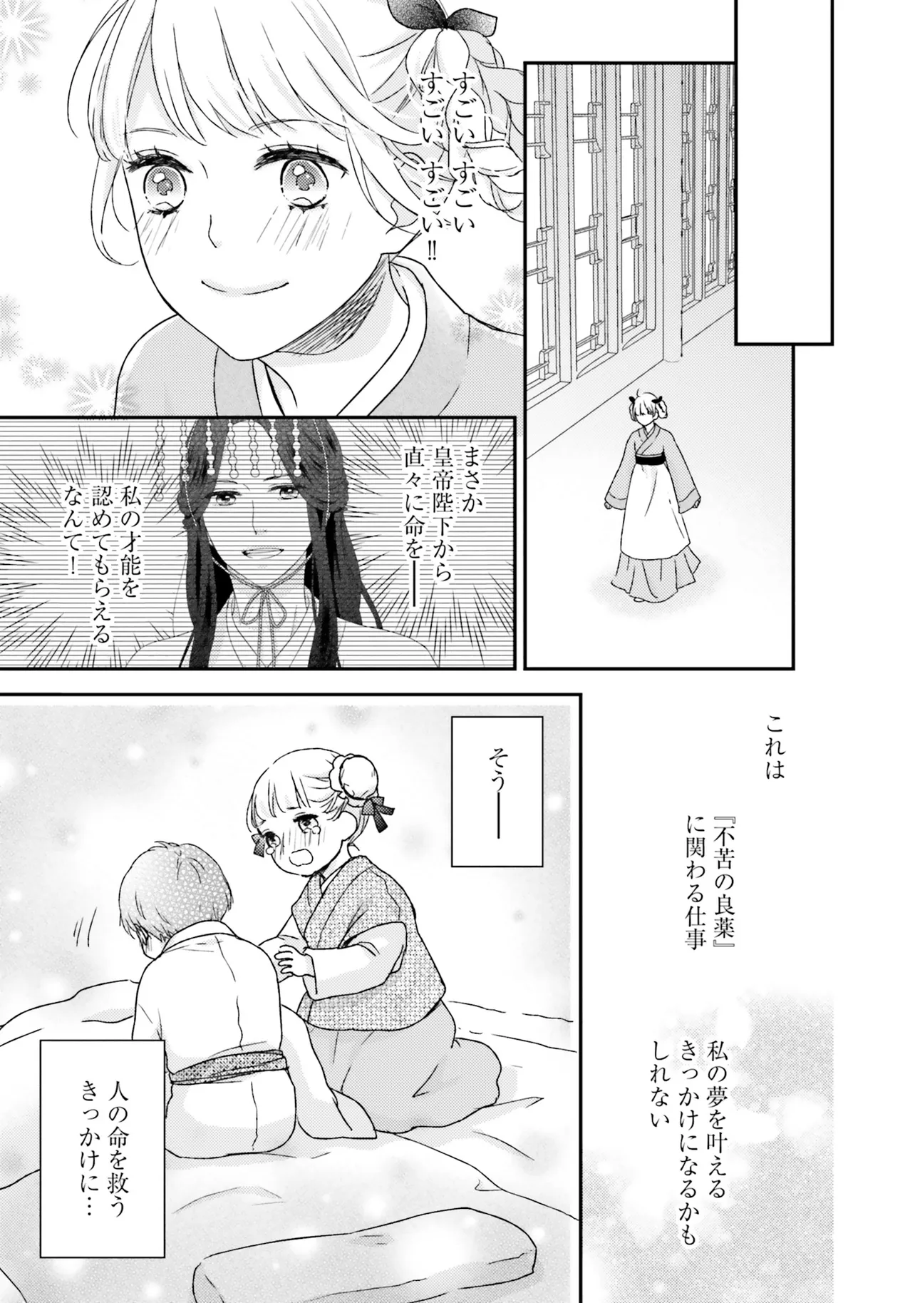 『不苦の良薬』――苦くない、誰でも飲みやすい良薬こそ至高。 後宮の官女・英鈴は、そう志して女だてらに薬師を目指している。 ある日、後宮で薬茶を売り始めると、珍しい処方に興味を持った皇帝から呼び出される。 すると、「甘党の余のために、苦い薬を飲みやすくしてほしい」と、皇帝専属のお薬係に任命された。 処方を気に入られた喜びも束の間、妃に昇格すると言われてしまい……? 「私が目指しているのは、妃ではなく薬師です!」 皇帝のお気に入りが「おいしい処方」を掲げて活躍する、中華おくすり物語!