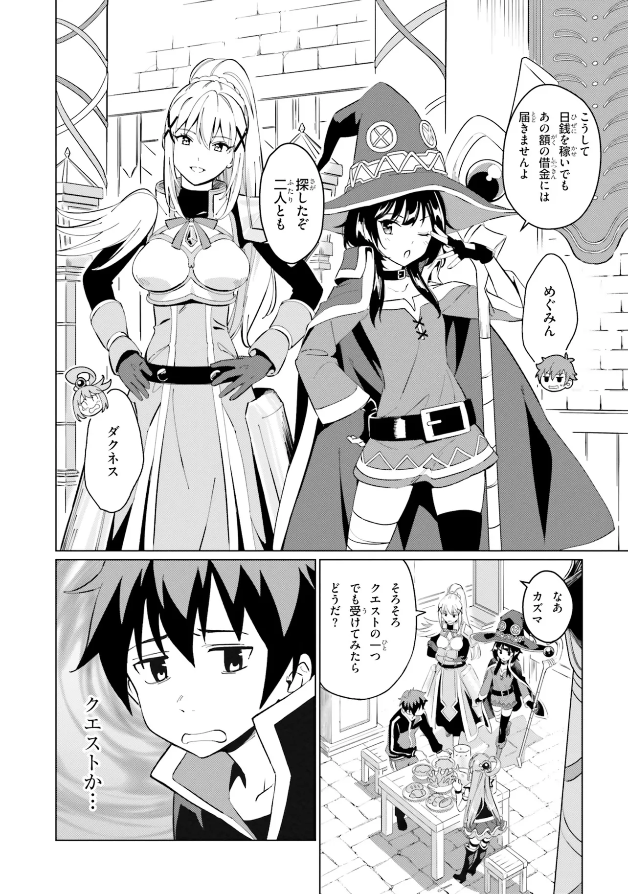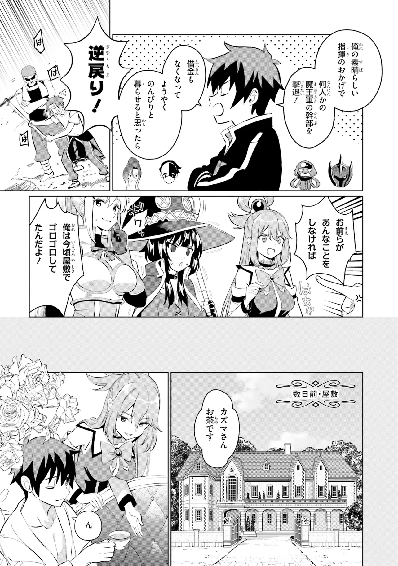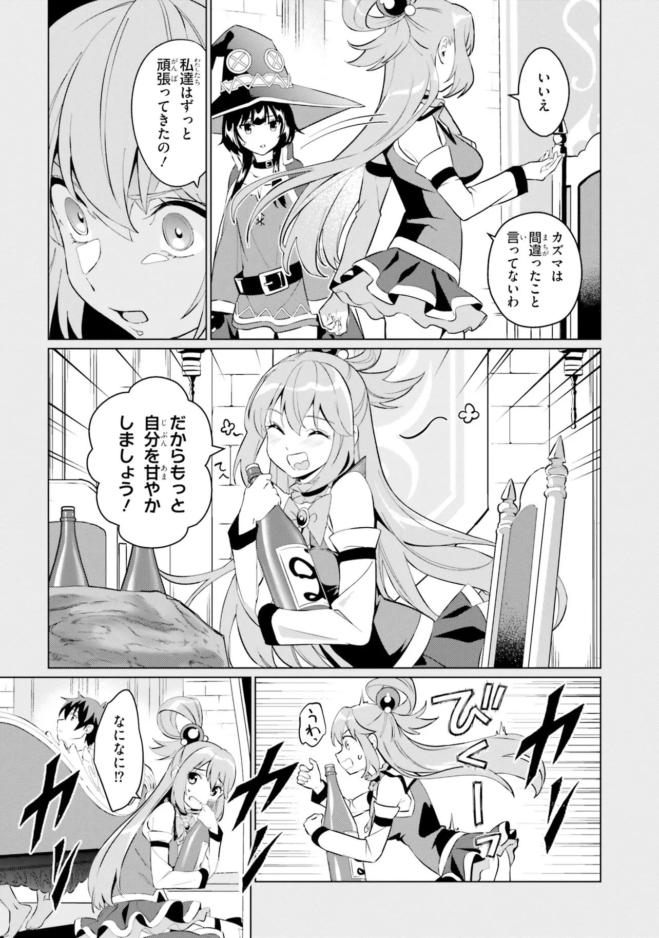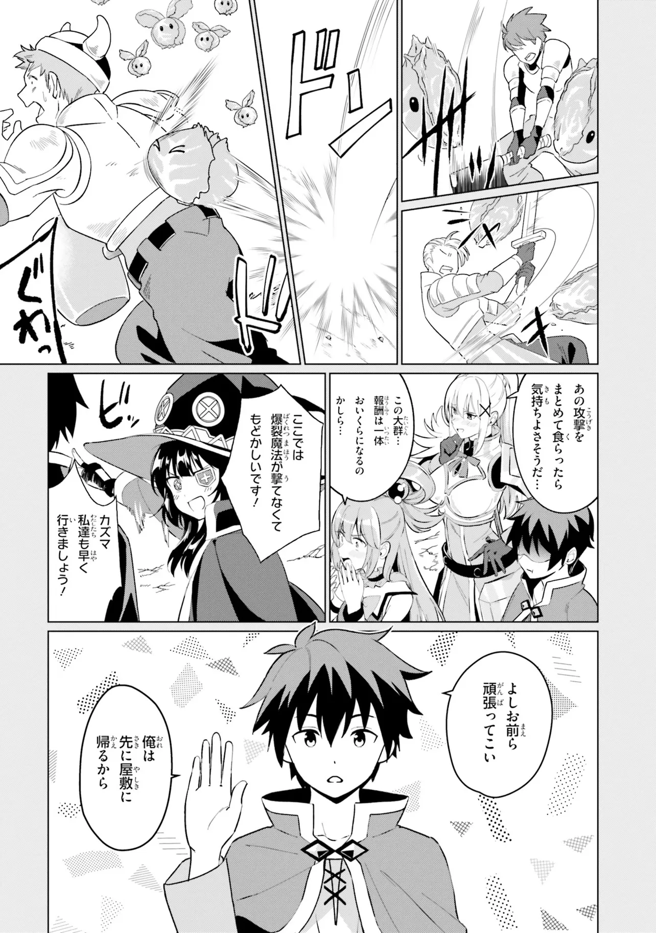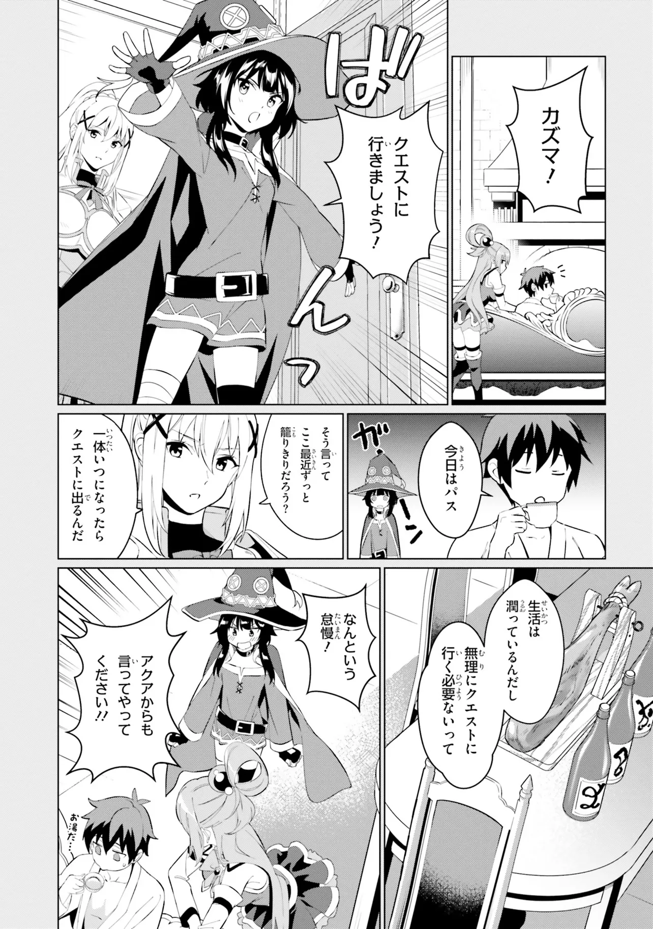 相も変わらず自堕落な生活を送り続けるカズマはめぐみんやダクネスに引きずられるようにしてクエストに向かうも、