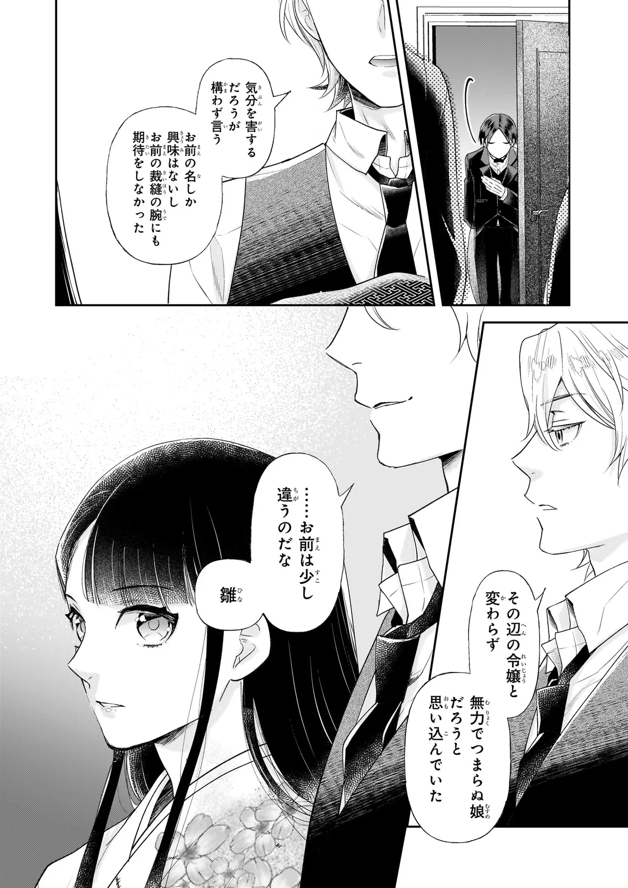 両親を失い、財産も奪われ、『廃屋令嬢』と笑われながらも、誇りだけは失わず生きてきた令嬢・雛。彼女のもとに、冷酷で美貌の実業家・鷹が現れる。自らの復讐のため、家柄を利用させろと契約婚を申し出る鷹に、雛はある願いの成就を条件として、名ばかりの花嫁となることを受け入れた。 敵の多い鷹との生活でも、雛は両親から継いだ教養と感性で困難を切り抜ける。 彼女の仕立てた服の噂が社交界に広まると、鷹の事業の助けにも繋がった。雛の賢明な生き方は、凍っていた鷹の心も少しずつ変えていって――。