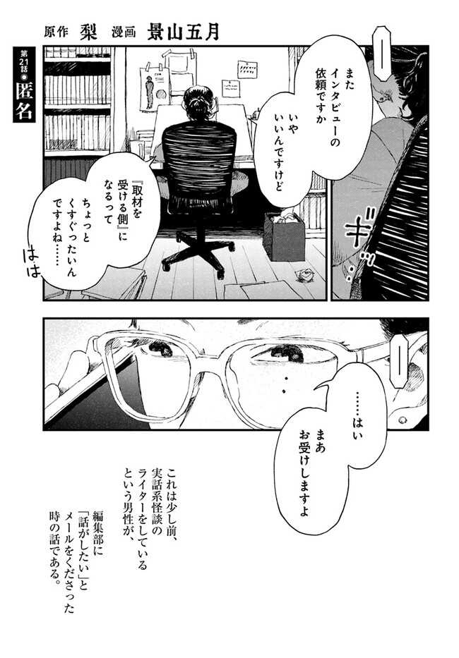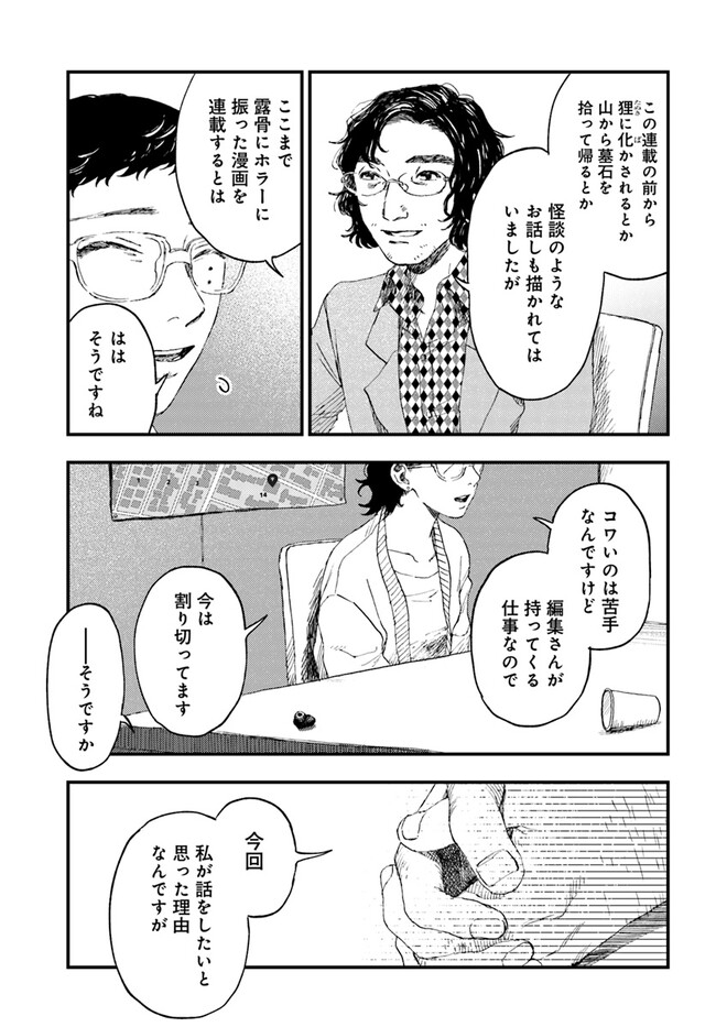 コワい話は≠くだけで。 第21話 コワい話は≠くだけで。 投稿者 admin - 2年 前に 幸せな読書漫画 コワい話は≠くだけで。 第21話 , いいねと共有ボタンをクリックすることを忘れないでください. Manga コワい話は≠くだけで。 常に更新されます 無料コミック Comic Top. 他のマンガの更新を読むことを忘れないでください。 マンガコレクションのリスト 無料コミック Comic Top マンガリストメニューにあります. お友達と共有しましょう! Facebook Twitter Pinterest Whatsapp 前のエピソード すべての章 次のエピソード リスト ページング Loading.. 前のエピソード すべての章 次のエピソード リスト ページング お友達と共有しましょう! Facebook Twitter Pinterest Whatsapp お気に入りに追加に続く 0 人 コワい話は≠くだけで。 ひょんなことから怪談を集めることになった一人の漫画家。 日常のすぐそばにある闇や恐怖、その収集の果てに行きつく先とは―――!? 景山五月(漫画)梨(原作) COMIC BRIDGEオカルトオリジナルコミックブリッジゾクゾクしちゃうホラー夢見る少女じゃいられない大人向け女性向け