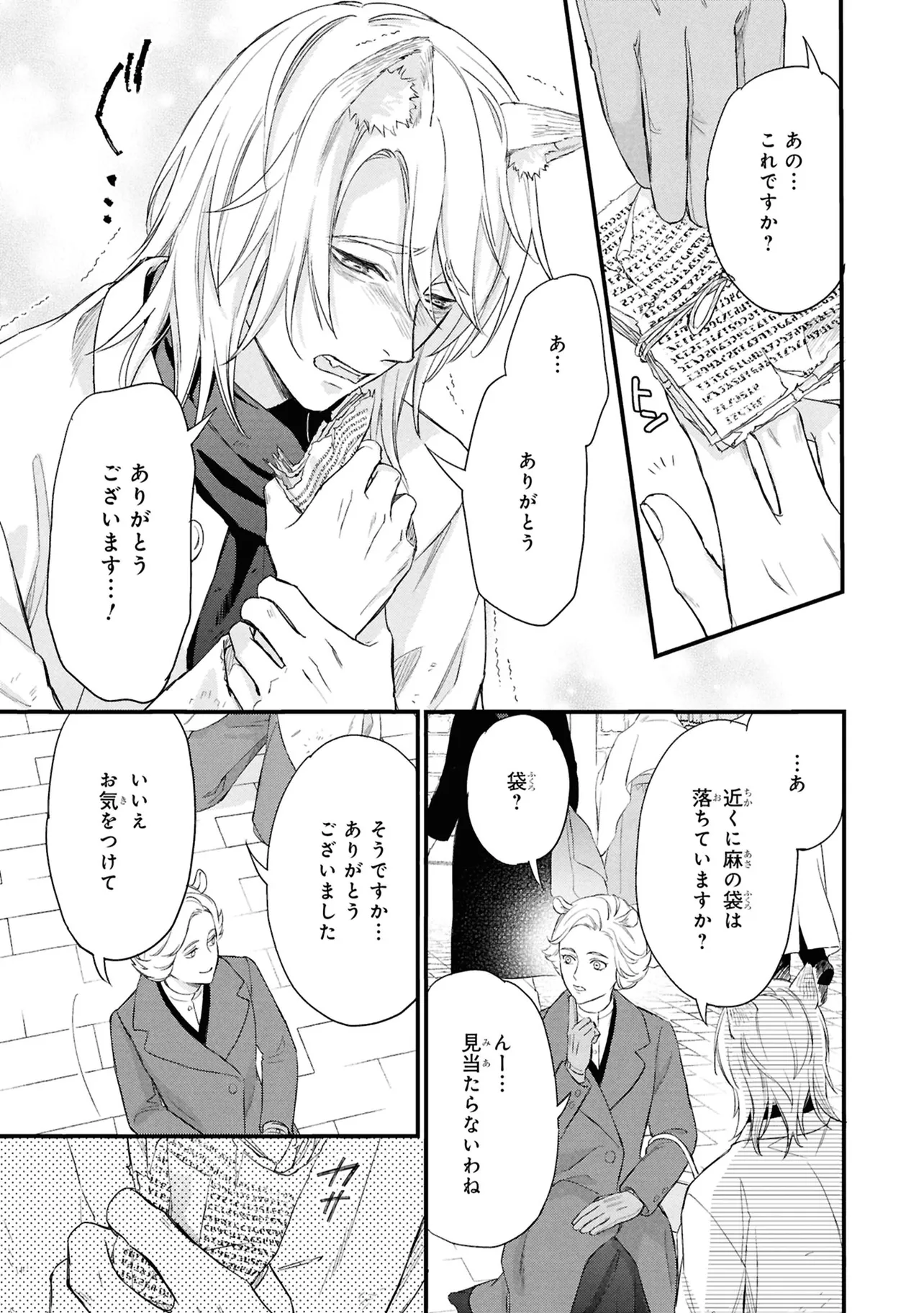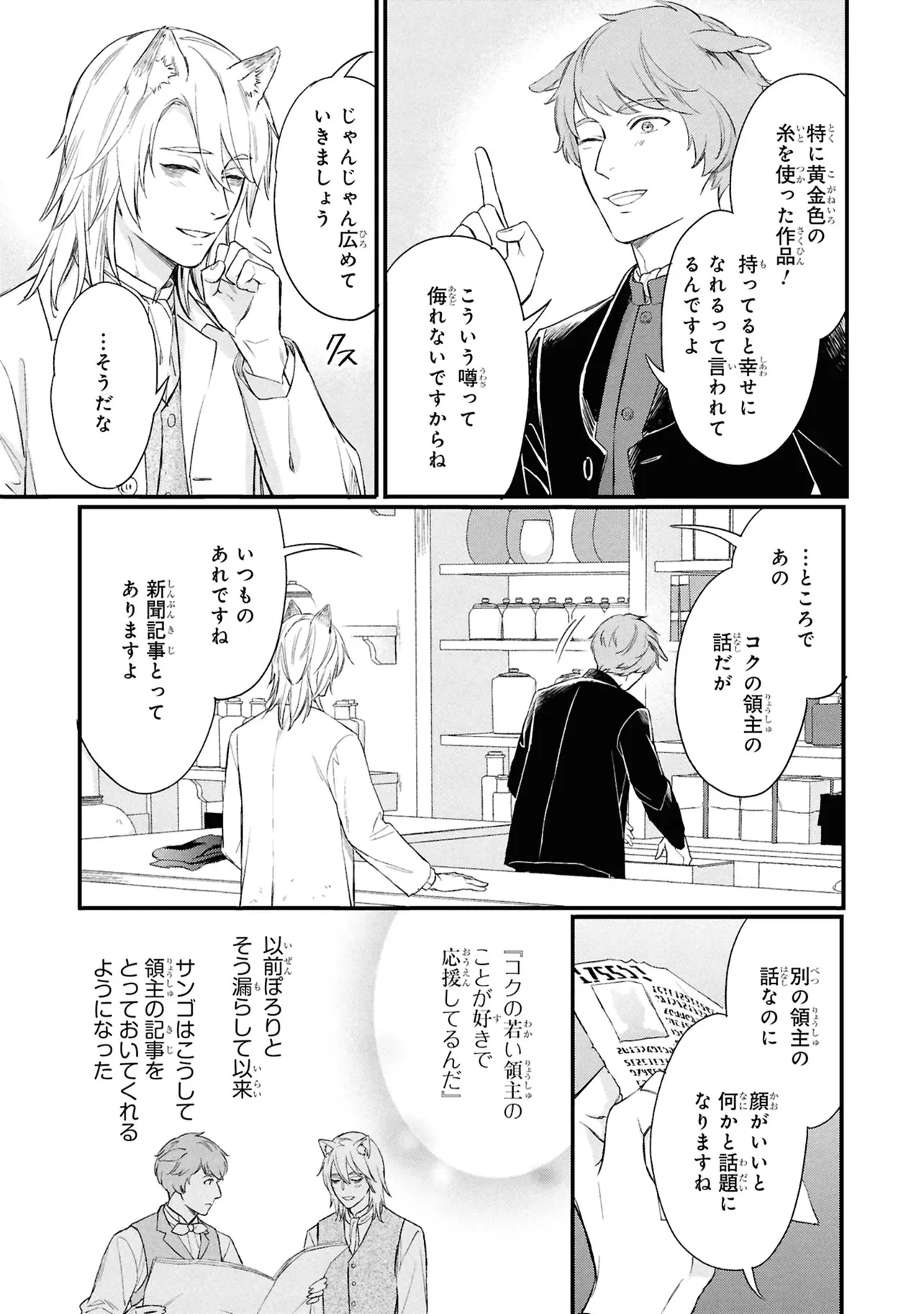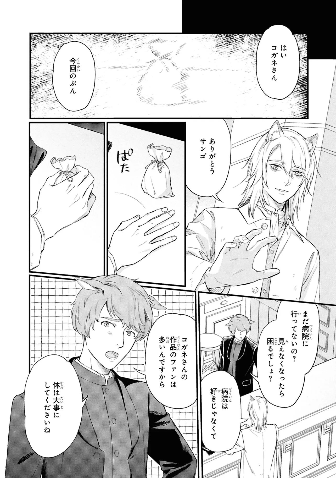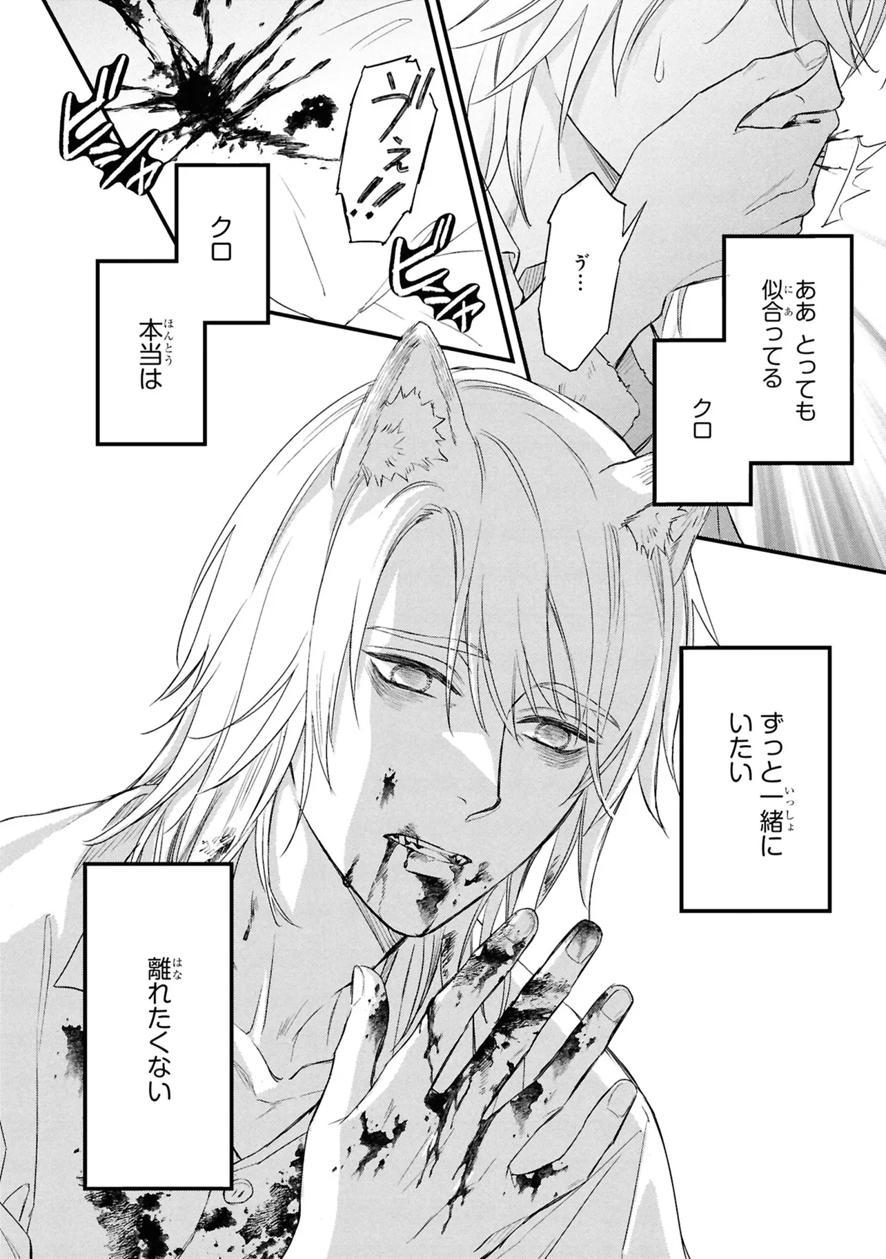 狐獣人のコガネは、父親が罪を犯したせいで村人からは恨まれ、身を粉にして働く毎日を送っていた。 そんな中、記憶もなく目も見えない猫獣人の子供を助け、育てていく決意をする。 やがて成長した子供・クロは、コガネに思慕の情を抱くが…。