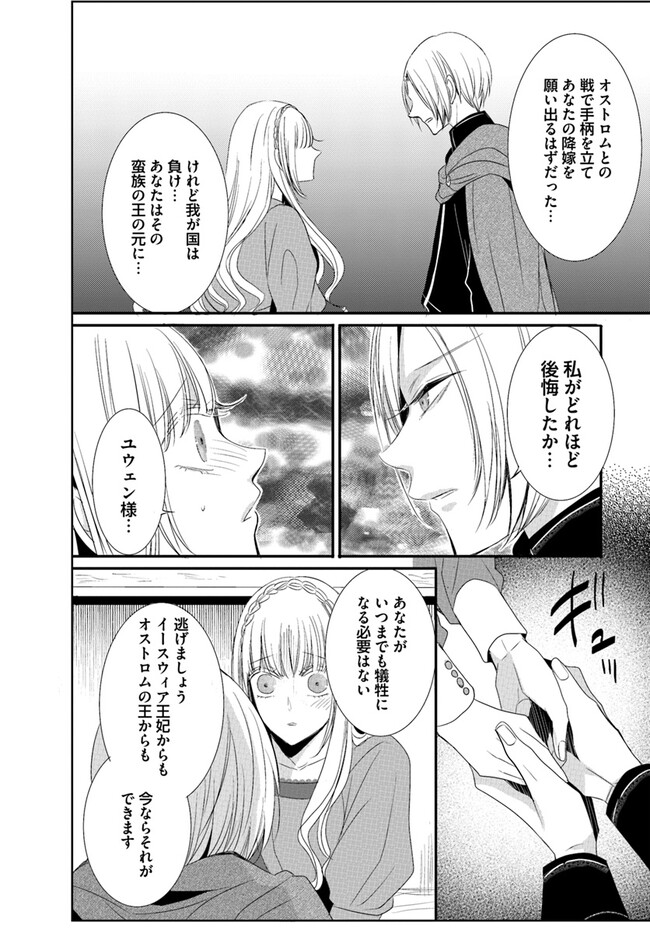 妾腹ということで王妃らに虐げられて育ってきたゼルスの王女エデルは、戦に負けた代償として義姉の身代わりで戦勝国へ嫁ぐことに。相手は「黒狼王(こくろうおう)」と渾名されるオルティウス。野獣のような体で闘うことしか能がないと噂の蛮族の王。しかし結婚の儀の日にエデルが対面したのは、瞳に理知的な光を宿す黒髪長身の美しい青年で――。やがて、二人の邂逅は王国の存続を揺るがす事態に発展するのだった…。激動の運命に翻弄される、波瀾万丈のシンデレラロマンス、待望のコミカライズ版!