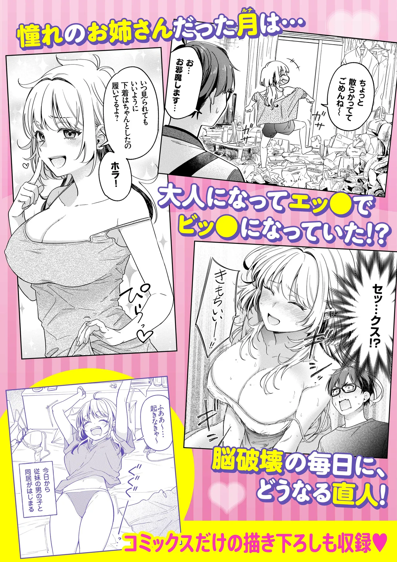 昔好きだったお姉さんといきなり同棲!?しかもヤリマ●疑惑が浮上!? 一浪して大学に合格した青年・木吉直人。上京のために住める場所を探していたところ、親戚で憧れの姉・月(ルナ)の家で同棲することに。 昔憧れていた月は垢ぬけて、美しく成長し…そして…ビッチになっていた!?夜な夜なあられもない嬌声を聞き、モンモンとする直人。 他の男性がいる割に距離感もめちゃくちゃ近い。何を考えているか分からない月に翻弄され、さらに月以外の エッチで癖が強い女の子たちも集まりだし…!? ビッチ?なお姉さんたちに囲まれる楽しい新生活、開幕ーー。