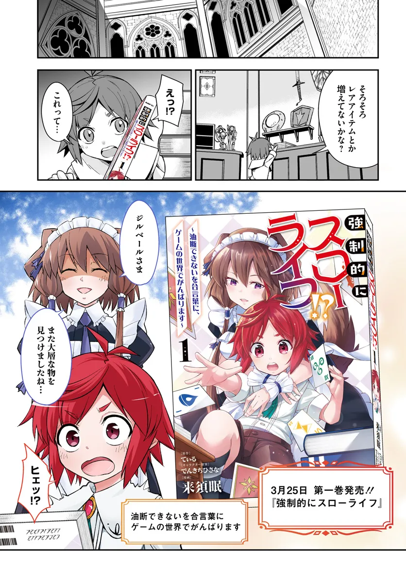 強制的にスローライフ!?~油断できないを合言葉に、ゲームの世界でがんばります~ 単行本1巻告知漫画