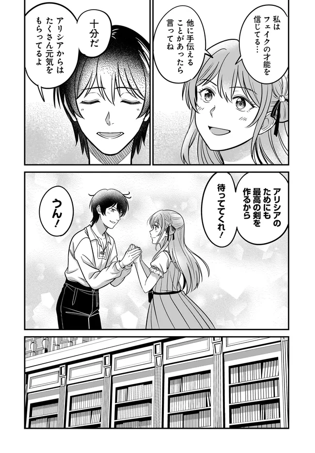 どれだけいじめられても一心に鍛冶に取り組むフェイクは、ある日突然隣国の公爵令嬢・アリシアに婚約者として引き抜かれることに!?