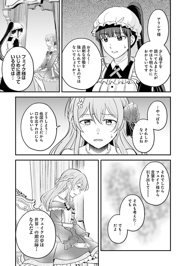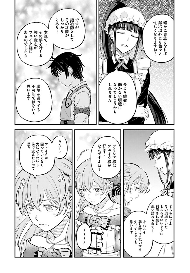どれだけいじめられても一心に鍛冶に取り組むフェイクは、ある日突然隣国の公爵令嬢・アリシアに婚約者として引き抜かれることに!?