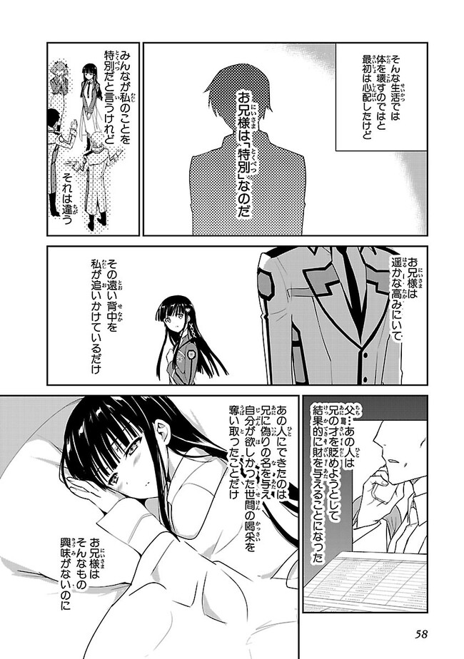 魔法。それが現実の技術となってから一世紀弱。魔法を保持・行使する「魔法師」育成機関「魔法科高校」に今春、とある少女が入学する。容姿端麗で完全無欠な優等生――彼女の名は、司波深雪。共に入学した兄・達也との仲睦まじい高校生活を夢見ていた彼女の前に、一科生と二科生――優等生と劣等生との壁が立ちはだかり!?