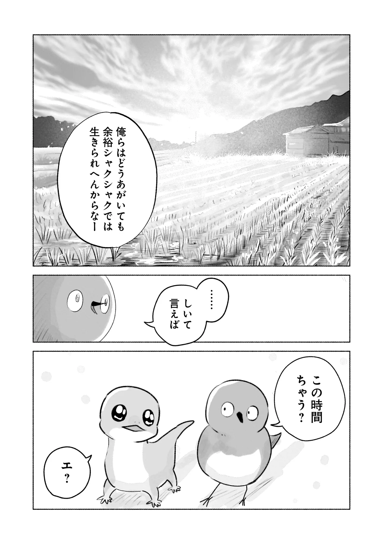 田舎で暮らすメジとヤモは、 近所をうろつく天敵・ネコの観察に余念がない。 最近は、人間とネコの交流が気になリ、モノマネしてみたり近づいて瀕死で逃げてみたり。 今日も2匹は、他の生き物たちに思いを馳せながら、 軽快におしゃべりを繰り広げる。