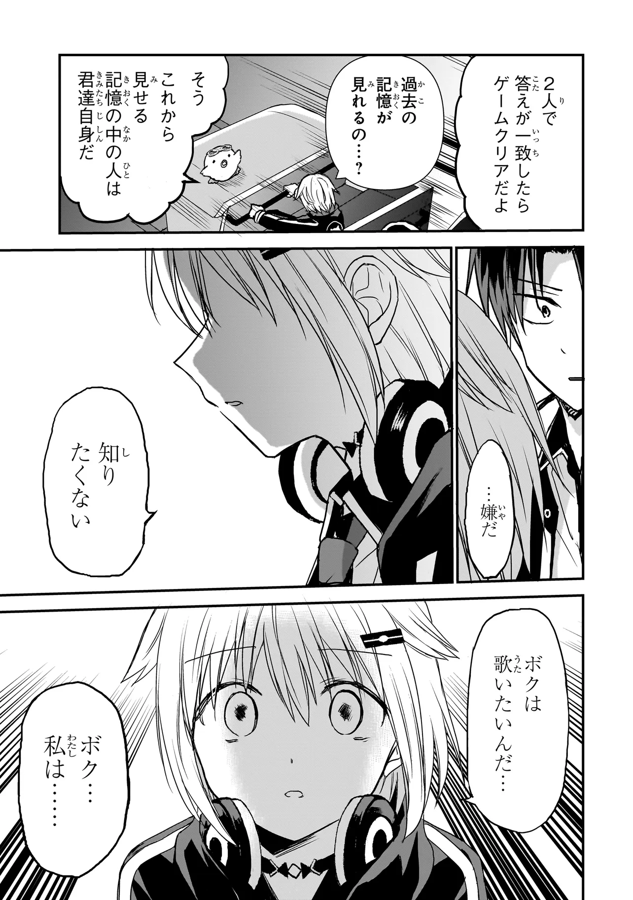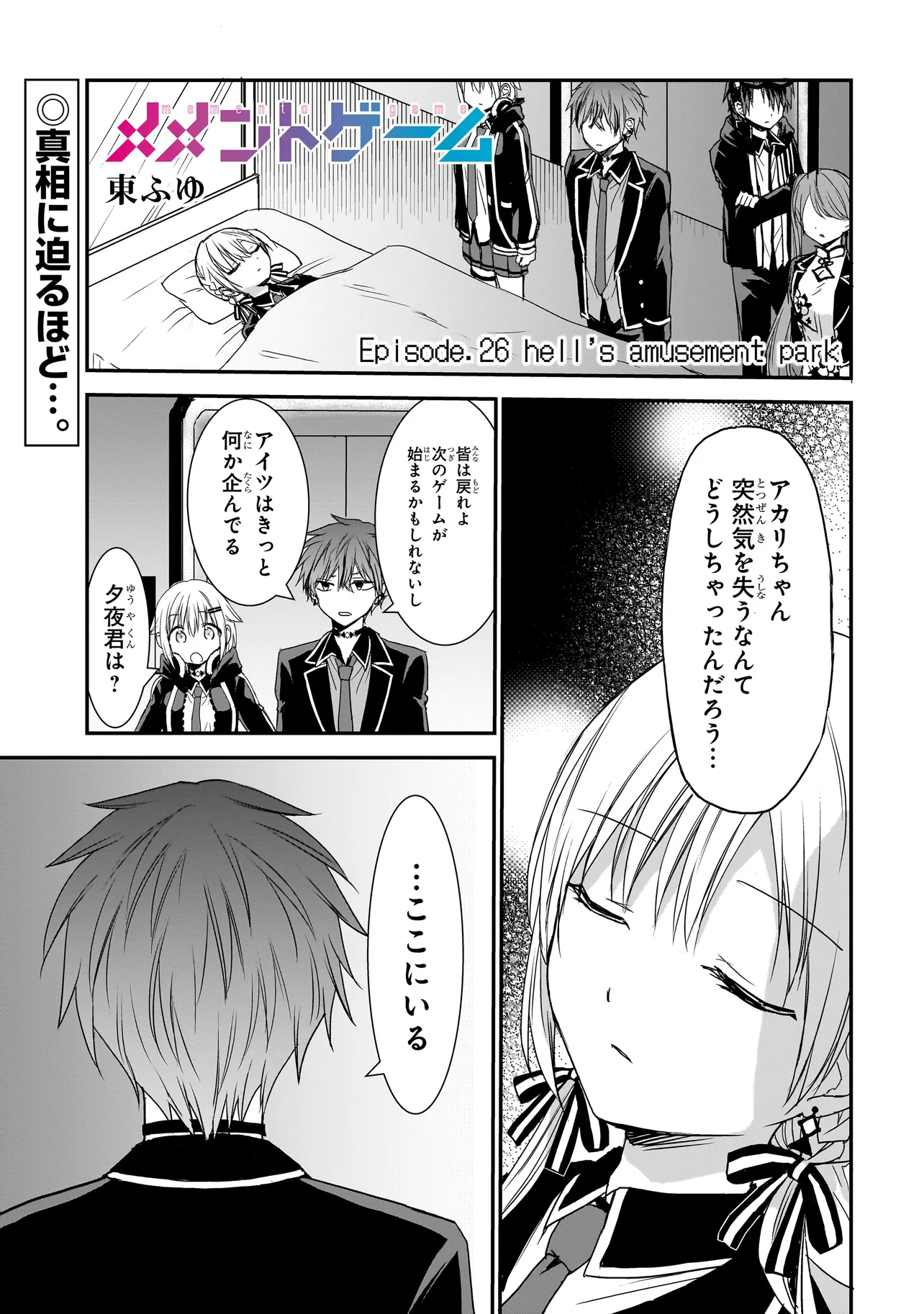 メメントゲーム 第26話 メメントゲーム 投稿者 admin - 6か月 前に 幸せな読書漫画 メメントゲーム 第26話 , いいねと共有ボタンをクリックすることを忘れないでください. Manga メメントゲーム 常に更新されます 無料コミック Comic Top. 他のマンガの更新を読むことを忘れないでください。 マンガコレクションのリスト 無料コミック Comic Top マンガリストメニューにあります. お友達と共有しましょう! Facebook Twitter Pinterest Whatsapp 前のエピソード すべての章 次のエピソード リスト ページング Loading.. 前のエピソード すべての章 次のエピソード リスト ページング お友達と共有しましょう! Facebook Twitter Pinterest Whatsapp お気に入りに追加に続く 0 人 メメントゲーム エリート校の夕凪学園の落ちこぼれ・東雲夕夜。そんな彼と同じくぼっちでありながら、学年成績トップの日嗣アカリ。真逆でありながらどこか似た者同士な二人は、突然学園の地下深くに落ちていき、夕凪学園の裏側の世界・終夜学園のゲームに巻き込まれていく!!永遠に続く夜の学園にて二人一組で行われるゲームの報酬は、この世界の謎、そして彼ら自身の過去の記憶!!果たして彼らはこの世界に真実に辿り着くことができるのか――!?“記憶”と“信頼関係”が鍵となる、サバイバルゲーム学園サスペンス!! 東ふゆ カッコいいシリアススカッとするドキドキハラハラドラマ友情・仲間学園モノ成り上がり現代美少女