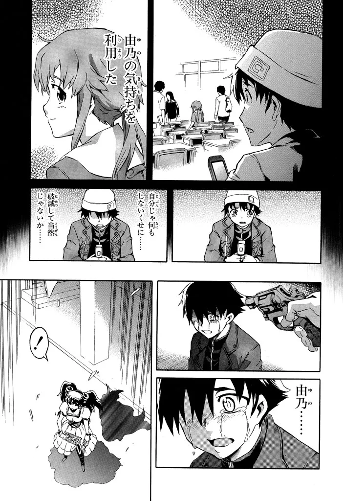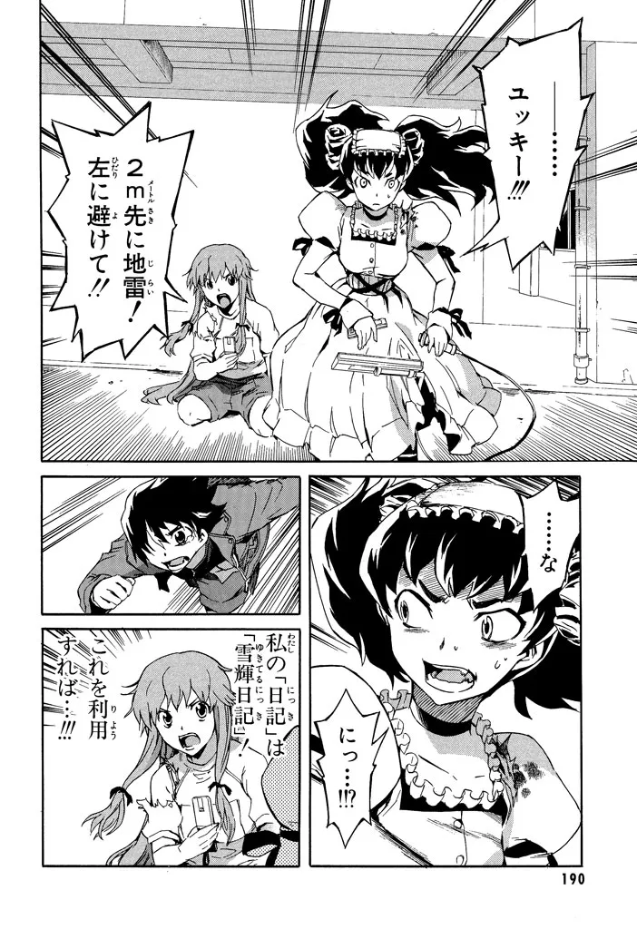 未来が書かれた日記を巡る、サバイバルゲーム! 日記が趣味の中学生・天野雪輝は、自分の携帯に未来の出来事が打ち込まれているのを見つける。だが、読み進んだ彼が見たものは、自らの死の記述だった!クラスメイトの少女・由乃を交え、空前のサバイバルゲーム勃発