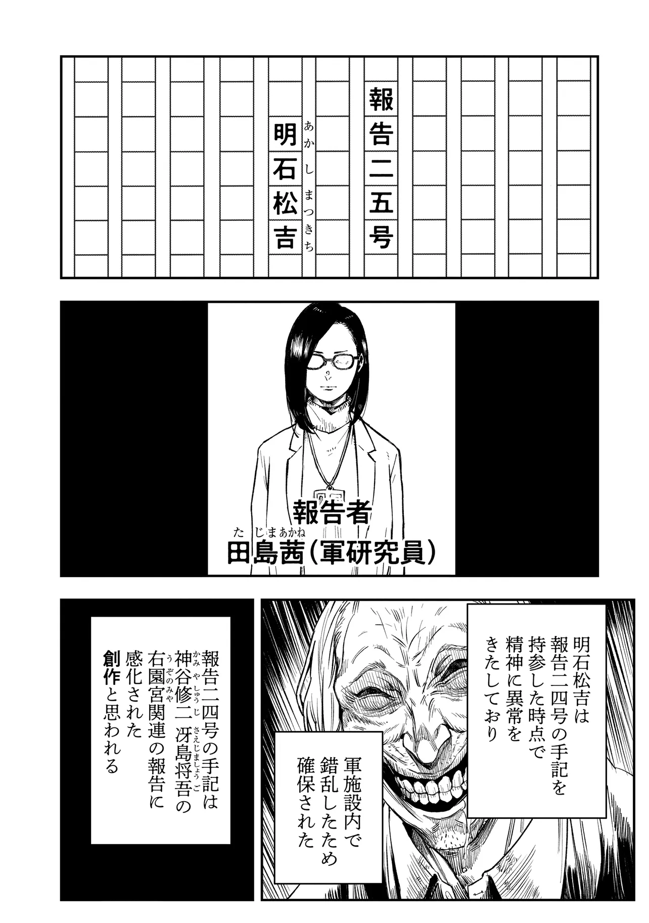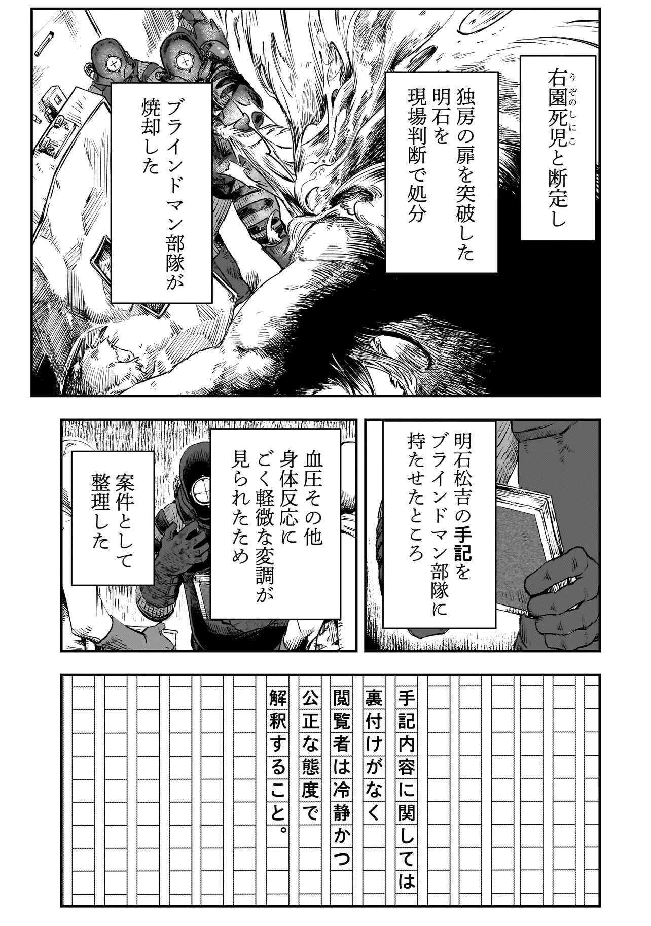 人間、動物、その他無機物の名称となった時に災害を誘引する右園死児。 規格外の現象の発端となるため、右園死児の文字列が含まれるすべてが禁忌扱いされている。 本書は、その原理の解明と対策を目的に発足した、明治二十五年から続く政府、軍、捜査機関、探偵、一般人による非公式調査報告体系である。