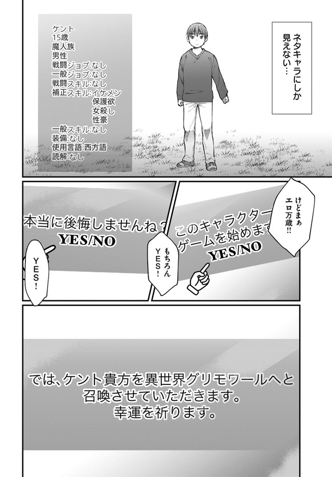 主人公・堀川健人は偶然見つけたネットゲームを、ネタ半分にキャラを作りゲームをスタートしたとたん、なんと異世界へ召喚されていた。そこはゲームのような不思議な世界。しかも、ネタで作ったキャラのため、戦闘ジョブ:なし、一般ジョブ:なし、戦闘スキル:なし、とひ弱なキャラになっていた。唯一持つ能力は“イケメン”に伴う補正スキルのみ。堀川健人ことケントは、“イケメンスキル”を駆使し、この世界で生き延びることができるだろうか…!?