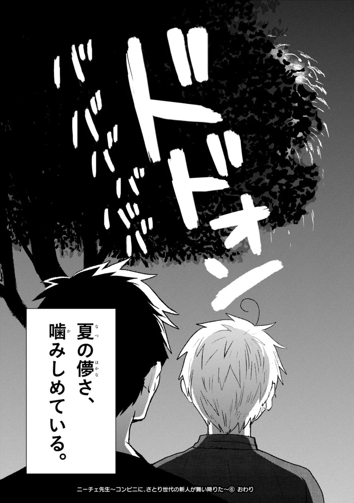 「神は死んだ」――閲覧数4000000数以上!!! Twitterを騒然とさせたさとり世代のコンビニ店員、ニーチェ先生ついに解禁!! 深夜のコンビニでアルバイトをしながら就職活動をしている松駒くんの元に、 一人の新人がやってきた。 『「お客様は神様だろぅ!?」とお怒りになったお客さんに対して、 淡々と「神は死んだ」と返した期待の大型新人が夜勤にやってきました。 ゆとり世代ならぬさとり世代である彼の今後の活躍に期待したいところです。』 Twitterに投下され一躍話題になった「ニーチェ先生」と松駒くんのコンビニバイトライフ!