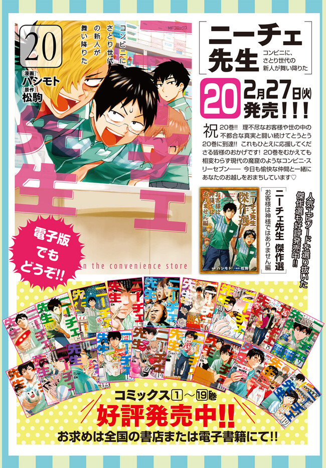 「神は死んだ」――閲覧数4000000数以上!!! Twitterを騒然とさせたさとり世代のコンビニ店員、ニーチェ先生ついに解禁!! 深夜のコンビニでアルバイトをしながら就職活動をしている松駒くんの元に、 一人の新人がやってきた。 『「お客様は神様だろぅ!?」とお怒りになったお客さんに対して、 淡々と「神は死んだ」と返した期待の大型新人が夜勤にやってきました。 ゆとり世代ならぬさとり世代である彼の今後の活躍に期待したいところです。』 Twitterに投下され一躍話題になった「ニーチェ先生」と松駒くんのコンビニバイトライフ!