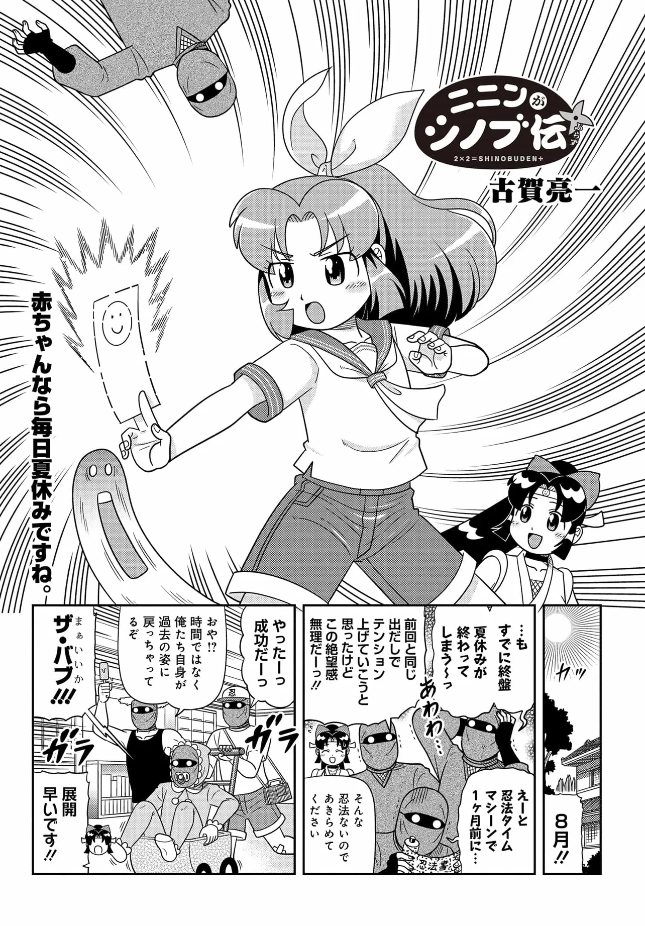 天然忍者シノブと、スーパーハンサムボーイ音速丸、そして愉快な仲間たちが帰ってきた! 伝説的ギャグマンガ「ニニンがシノブ伝」の正当続編が20年の時を経て令和の世にまさかの復活! めくるめく古賀亮一ワールド、とくとお楽しみあれ!