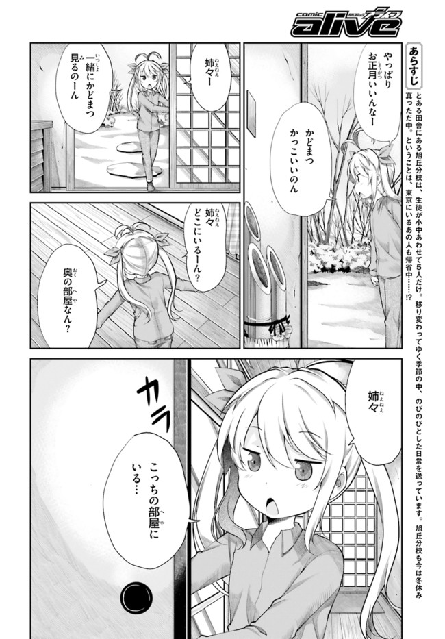 田舎にある学校「旭丘分校」には、小中合わせて生徒は5人のみ。みんな家の鍵は閉めないし、たぬきはよく出るし……どこか不便だけど、でも何だかんだで気ままに過ごしている。2013年10〜12月にTVアニメも放映された人気作