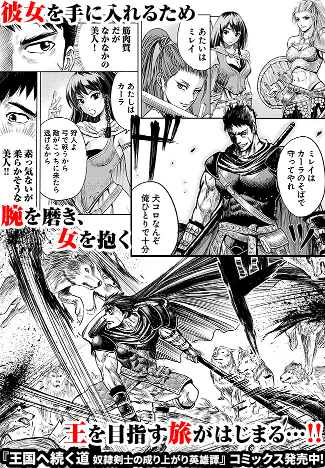 剣闘奴隷として育った男、エイギルにはたぐいまれなる戦闘の才能があった。 戦うことしかできない彼は森の奥深くに住む、吸血鬼の美姫・ルーシィと出会い、女の柔らかさを教わる。 ルーシィを手に入れようと願ったエイギルに、提示された条件はたったひとつ。 それは、自らの王国を手に入れること。 戦乱の時代、今、ひとりの男の覇道がはじまる! 女、暴力、名誉――。すべてが詰まった傑作ファンタジーをコミカライズ! 原作小説「王国へ続く道」Hobby Japan Novelsさまにて1~6巻絶賛発売中!