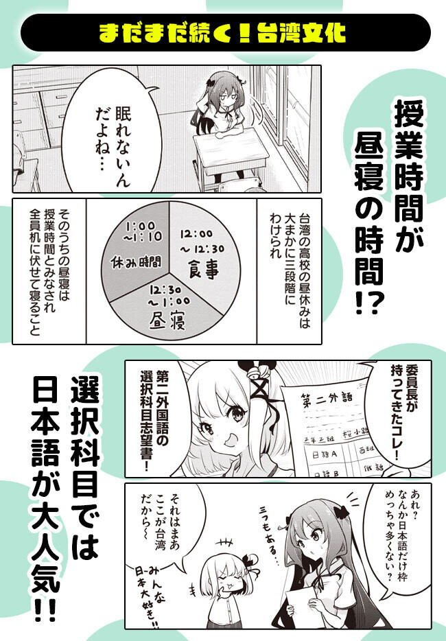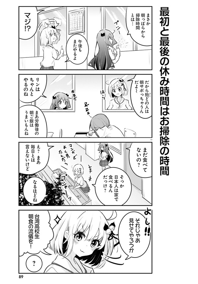 高校生活を台湾で過ごしてみた。 親の転勤により台湾の高校へ通うことになった桜小路杏奈。 中国語がわからず周りの生徒と コミュニケーションを取れずにいたが、 マンガとアニメが大好きで日本語が話せる少女 南美鈴と出会い台湾の文化や風習に触れていく。