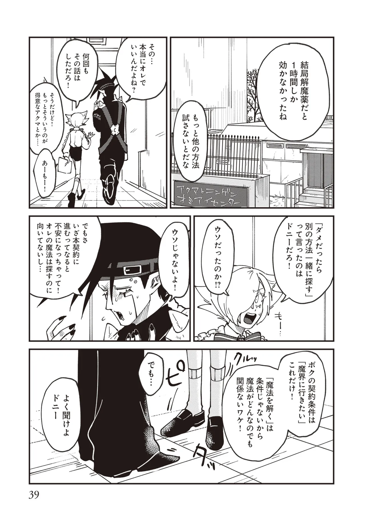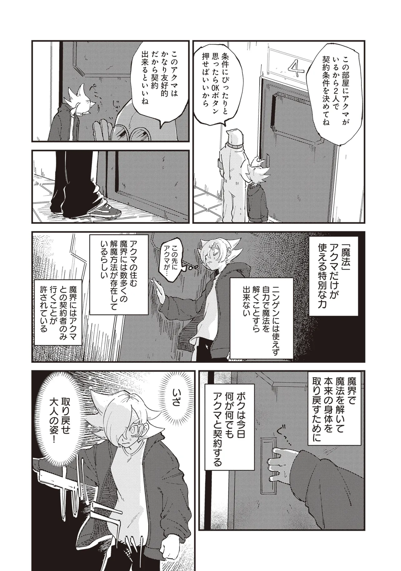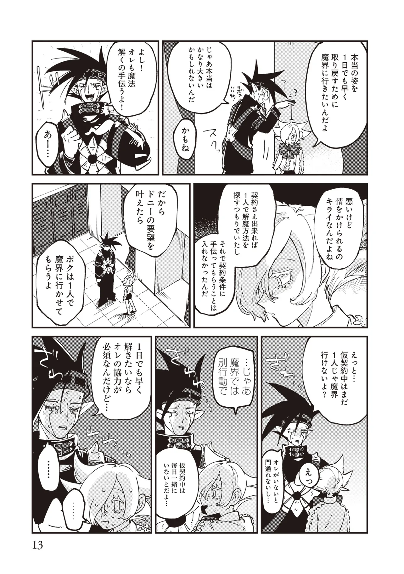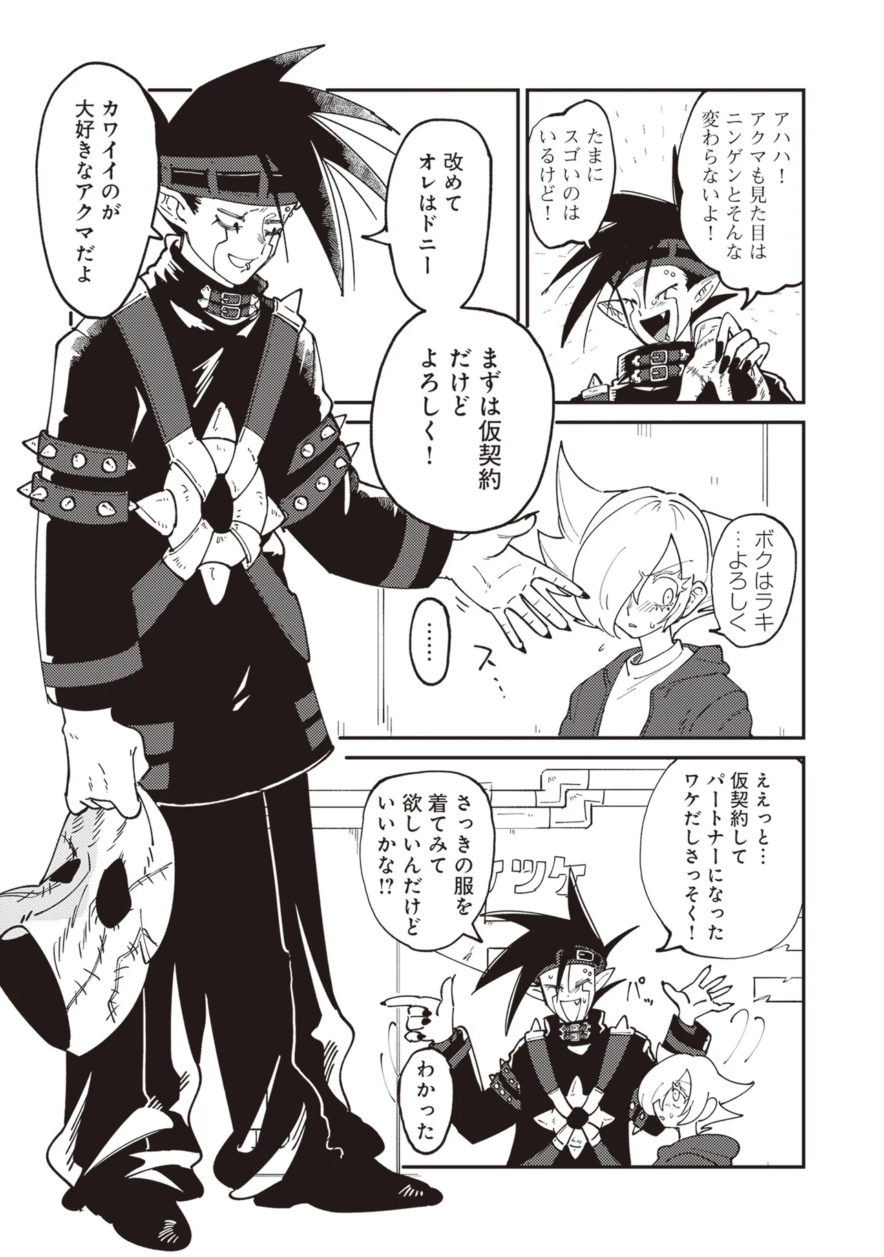 魔法の力により子供の身体で成長が止まったニンゲンのラキ。 カワイイものが大好きなアクマのドニー。 ふたりはニンゲンとアクマが契約するオミアイセンターで対面する。 ラキは魔法を解くため魔界の「解魔方法」を求め、 ドニーはカワイイ服を着てほしくて、それぞれ勢いだけで仮契約をしてしまう! かくしてニンゲンとアクマの魔界物語が始まるのだった!!