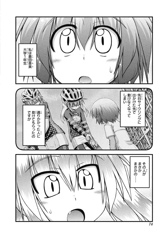運動全般苦手な倉田亜美(大学1年生)は、駅前で見かけた折りたたみ自転車に一目惚れ。その勢いのまま、貯金を全額おろしてサイクルショップへ向かうのだが…。