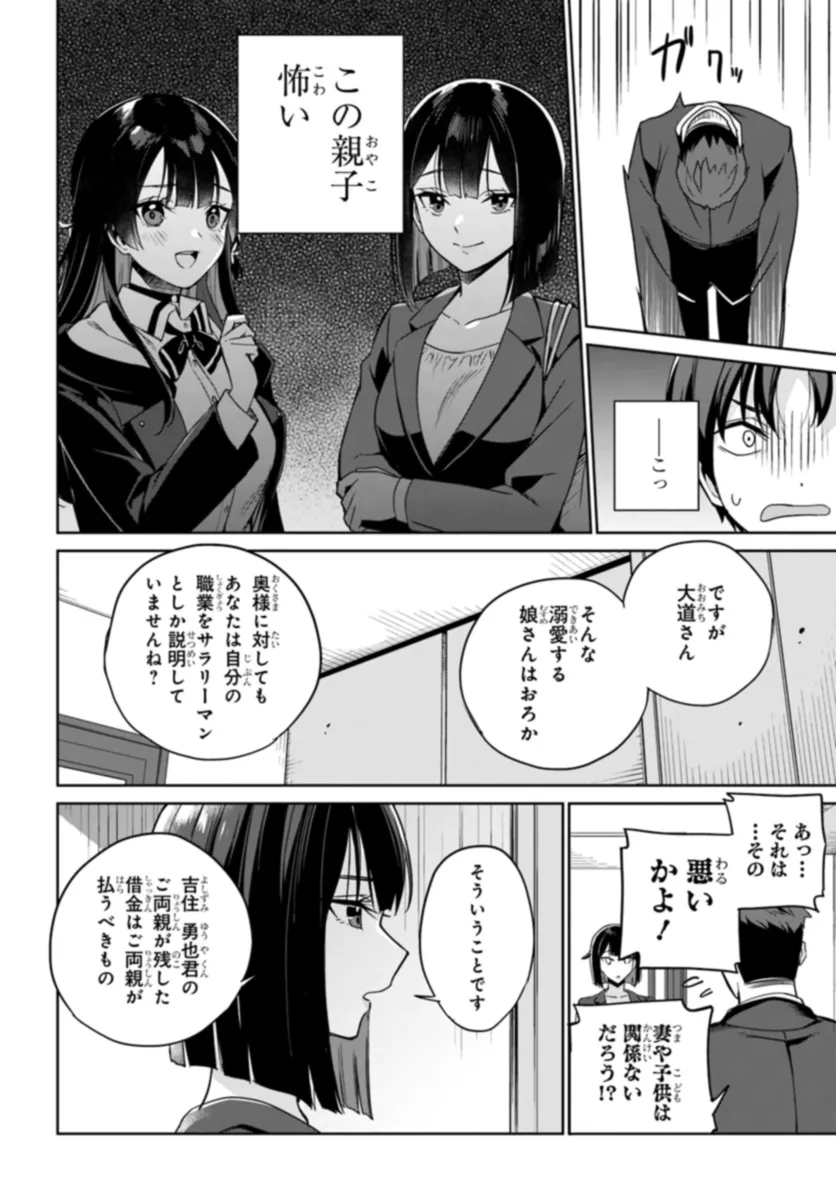 両親が借金3000万を残して海外逃亡…!? 吉住勇也は古馴染みの貸金業の面々と自宅リビングで向かい合い、静かに人生の終わりを悟っていた。 そんな最中、不意に現れたのは社長令嬢の同級生・一葉楓だった。 勇也も密かに憧れていた日本一可愛い女子高生1位に選ばれた楓は勇也の借金の肩代わりを告げる。 そして、肩代わりを受ける条件は勇也の思いもかけないものだった…!