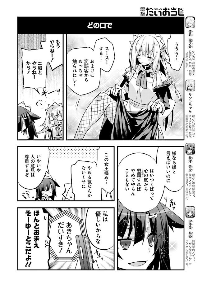 電撃だいおうじの人気No.1メイドが、 ニコニコユーザーを最高のおもてなし! 俺は佐倉龍之介。高校では手当たり次第にケンカを売り、 ボスと呼ばれる地位まで登りつめた。 なのに、男の中の男であるハズの俺がどうして…… どうしてメイド喫茶で“メイドさん”なんかしてるんだぁっ!?